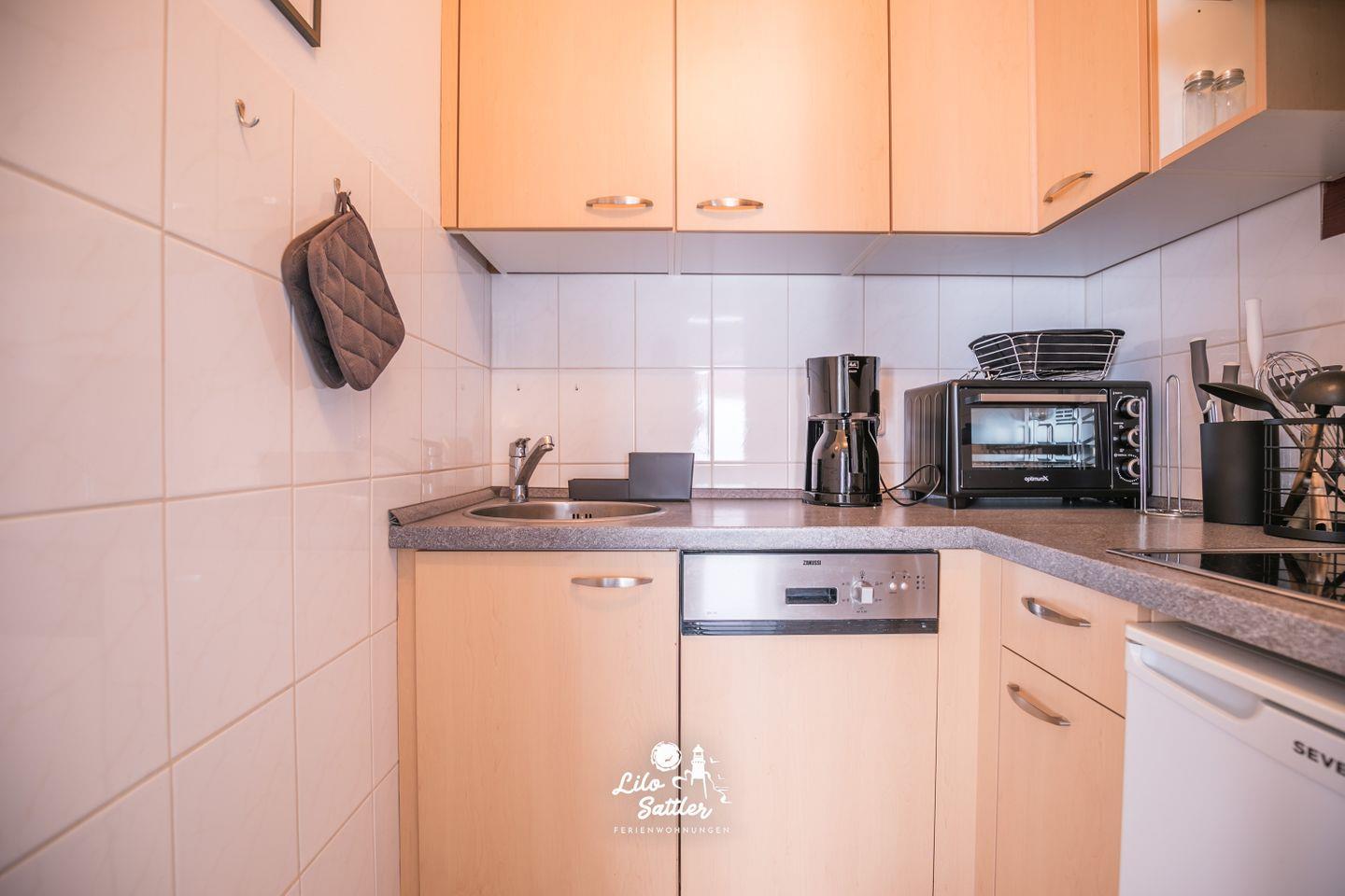 Spüle, Kühlschrank, kleiner Backofen, Geschirrspüler, Ceranfeld mit Abluft, Kaffeemaschine, Toaster, Wasserkocher