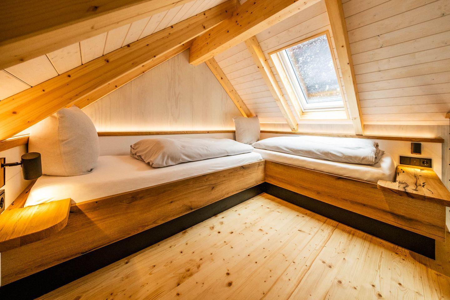 Der Zugang zu den Schlafbereichen erfolgt über eine Leiter bzw. steile Stufen. Hinweis für Familien mit kleinen Kindern