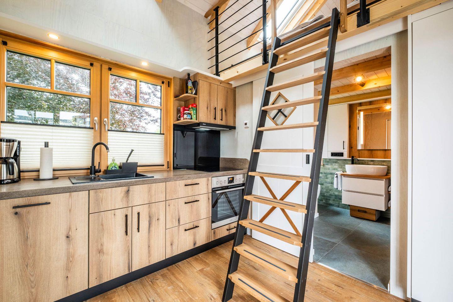 Bitte beachten Sie, dass sich in unseren Tiny Houses eine relativ steile, nicht vollständig gesicherte Treppe befindet. Diese erfordert sicheres, selbstständiges Gehen und eine gute Koordination.