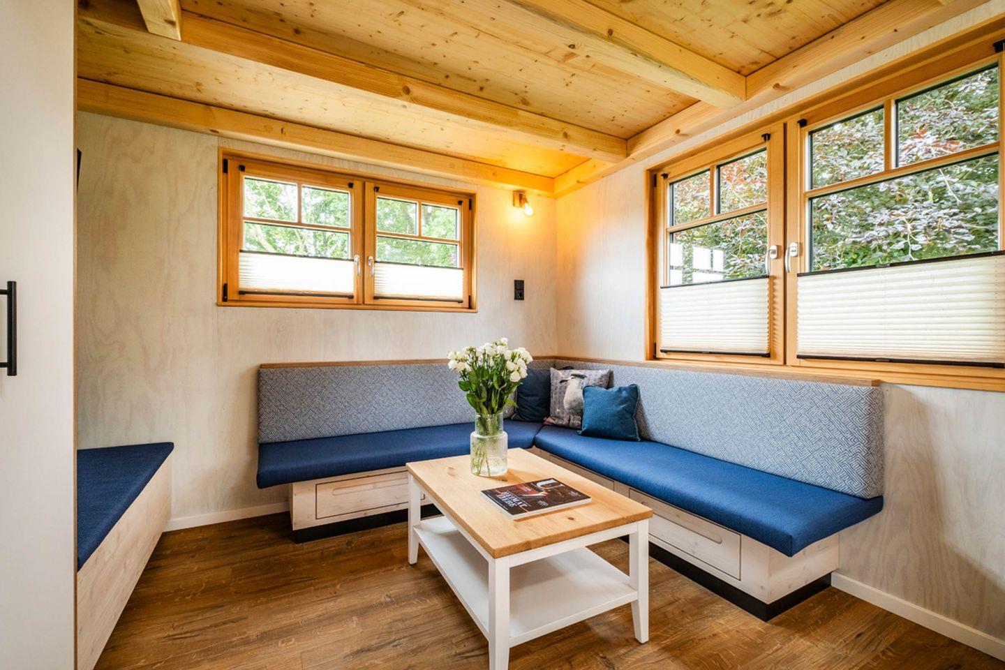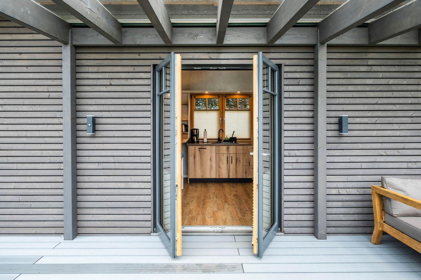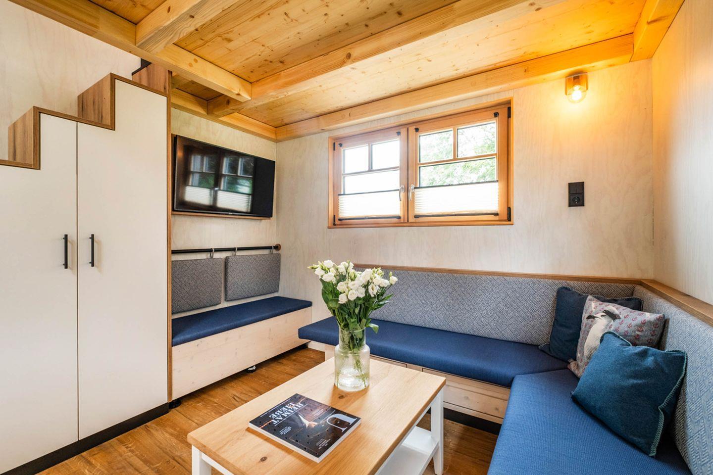 Das Tiny-House Piggeldy ist mit einer überdachten Terrasse ausgestattet, auf der Sie entspannen und die schöne Aussicht genießen können. Die helle und einladende Wohnküche bietet alles, was Sie für die Zubereitung köstlicher Mahlzeiten benötigen. Der Essbereich ist perfekt für gesellige Abende mit der Familie. Entspannen Sie sich auf dem bequemen Sofa oder genießen Sie Ihre Lieblingssendungen auf einem der Fernseher. Durch die hohe Qualität der Einrichtungen ist Komfort und Gemütlichkeit garantiert.