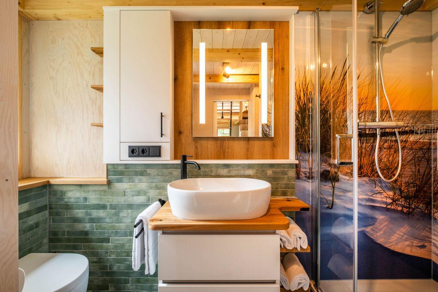 Das Tiny-House besticht durch seine moderne und gemütliche Ausstattung. Die beiden Schlafzimmer sind einladend und komfortabel eingerichtet, sodass erholsame Nächte garantiert sind. Eines der Schlafzimmer verfügt über ein Doppelbett. Im zweiten Schlafzimmer finden Sie zwei Einzelbette. Der offene Wohnbereich mit einem bequemen Sofa und einem Esstisch lädt zum gemeinsamen Verweilen ein. Hier können Sie nach einem aufregenden Tag an der Küste entspannen und gemütliche Abende verbringen. Der Fernseher im Wohnbereich sorgt für Unterhaltung, während die Küche mit allen notwendigen Annehmlichkeiten ausgestattet ist, sodass Sie Ihre eigenen Mahlzeiten zubereiten können. Ein modernes Badezimmer rundet das Wohnkonzept ab.