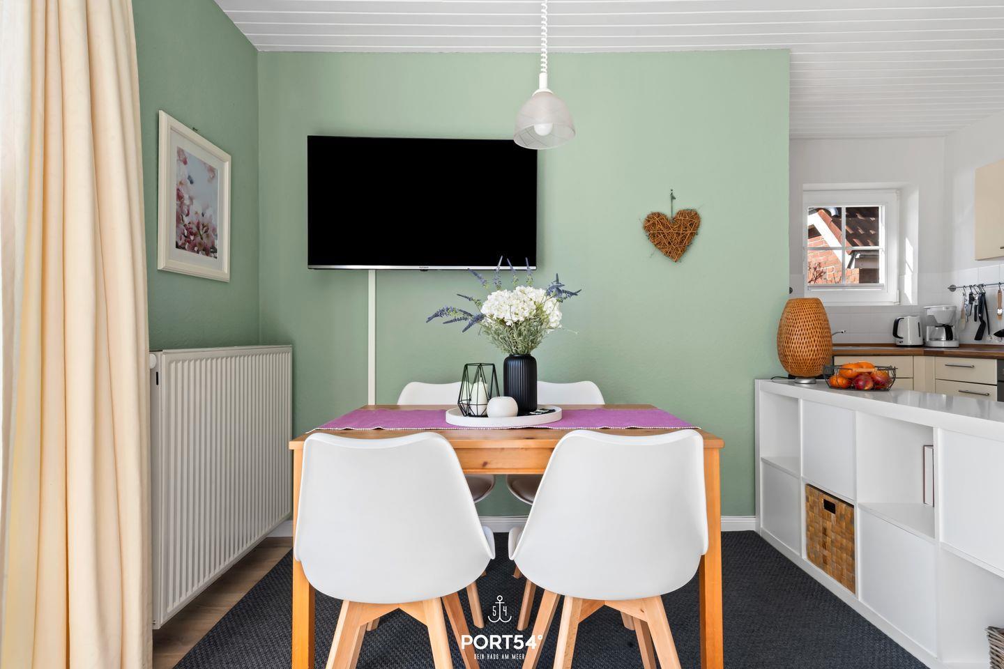 Mit einer Wohnfläche von 45 m² bietet die Ferienwohnung Platz für bis zu vier Personen. Sie betreten die Wohnung im Parterre und finden einen offenen Wohnbereich vor, der mit einer einladenden Sofaecke, einem Esstisch und einem vollständigen Unterhaltungsangebot ausgestattet ist, einschließlich zwei Fernsehern und WLAN-Zugang. Hier verbringen Sie entspannte Stunden nach einem ereignisreichen Tag an der Küste.