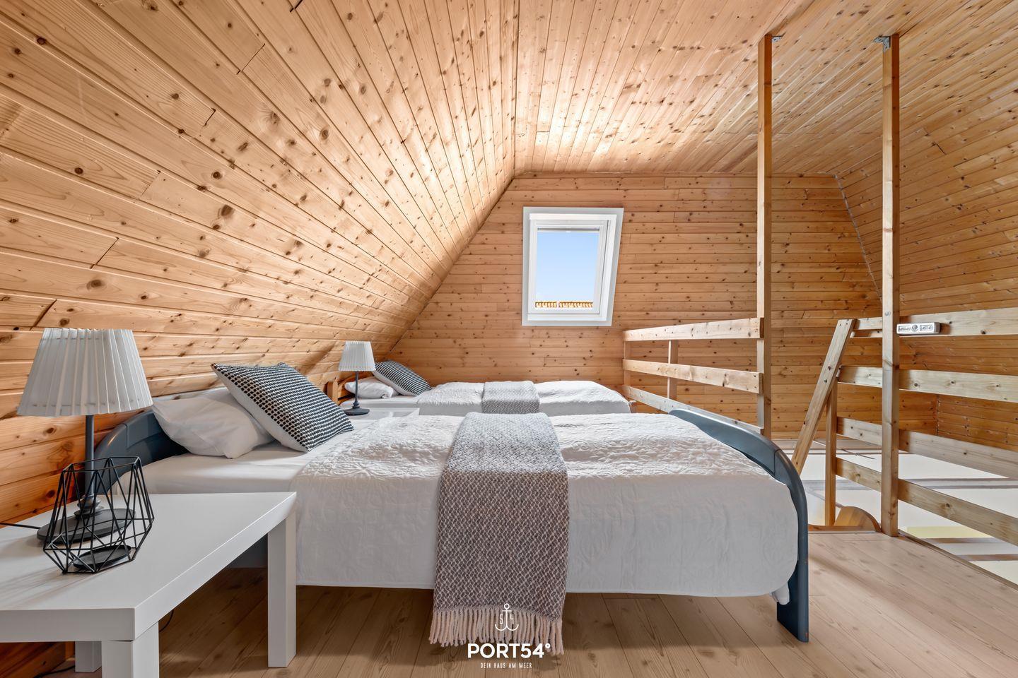 Über dem Wohnraum befindet sich die gemütliche offene Galerie mit 3 Einzelbetten und TV.