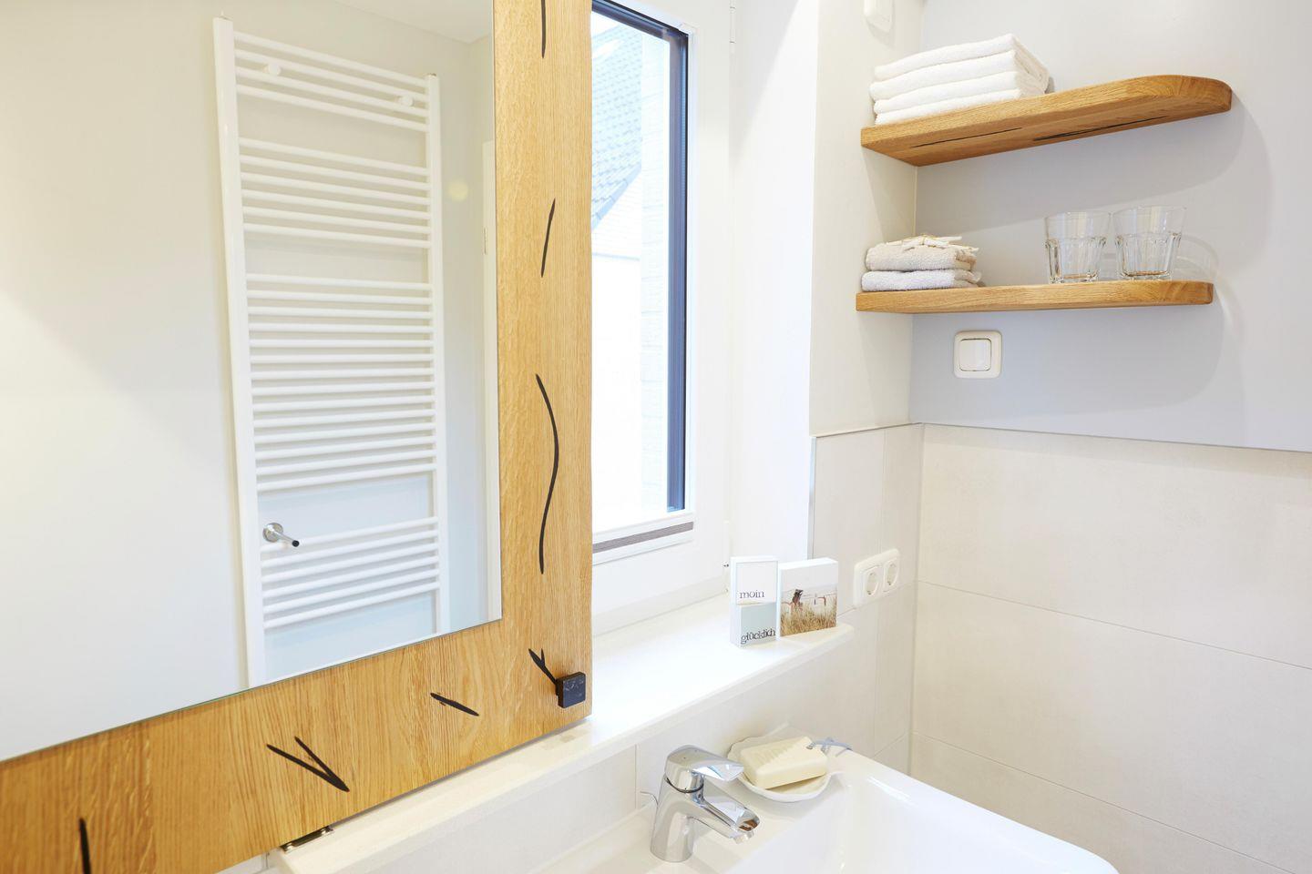 Das moderne tageslicht Badezimmer überzeugt durch eine bodengleiche Dusche, ein WC, Waschbecken und warmes Wasser. Hier finden Sie auch einen Haartrockner sowie einen großen Spiegel.