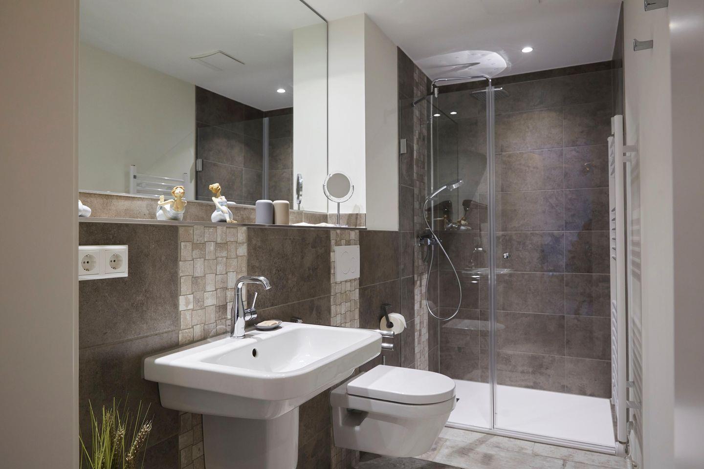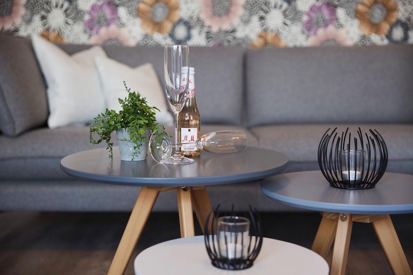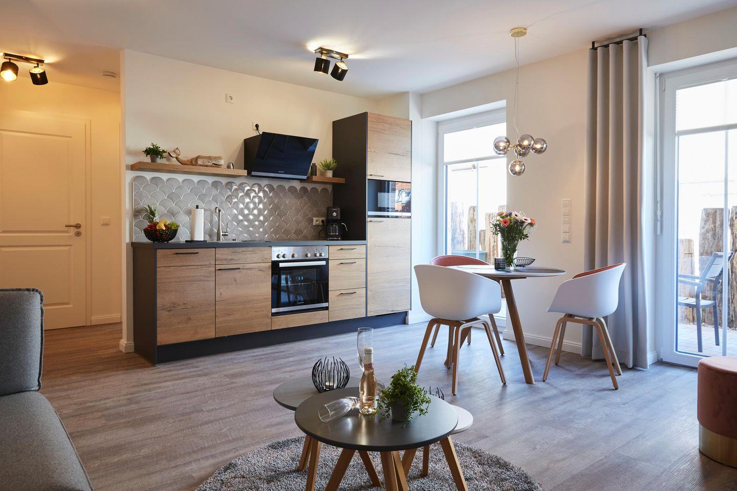 Zudem verfügt das gesamte Apartment über eine Fußbodenheizung. Für einen ruhigen Schlaf sorgt das komfortable Boxspringbett sowie die dreifach verglasten Fenster mit elektrischen Außenjalousien. Die vollausgestattete Wohnküche lädt zum gemeinsamen Kochen ein. Das moderne Badezimmer besticht durch seine bodentiefe Dusche, Handtuchheizkörper und einem Föhn.