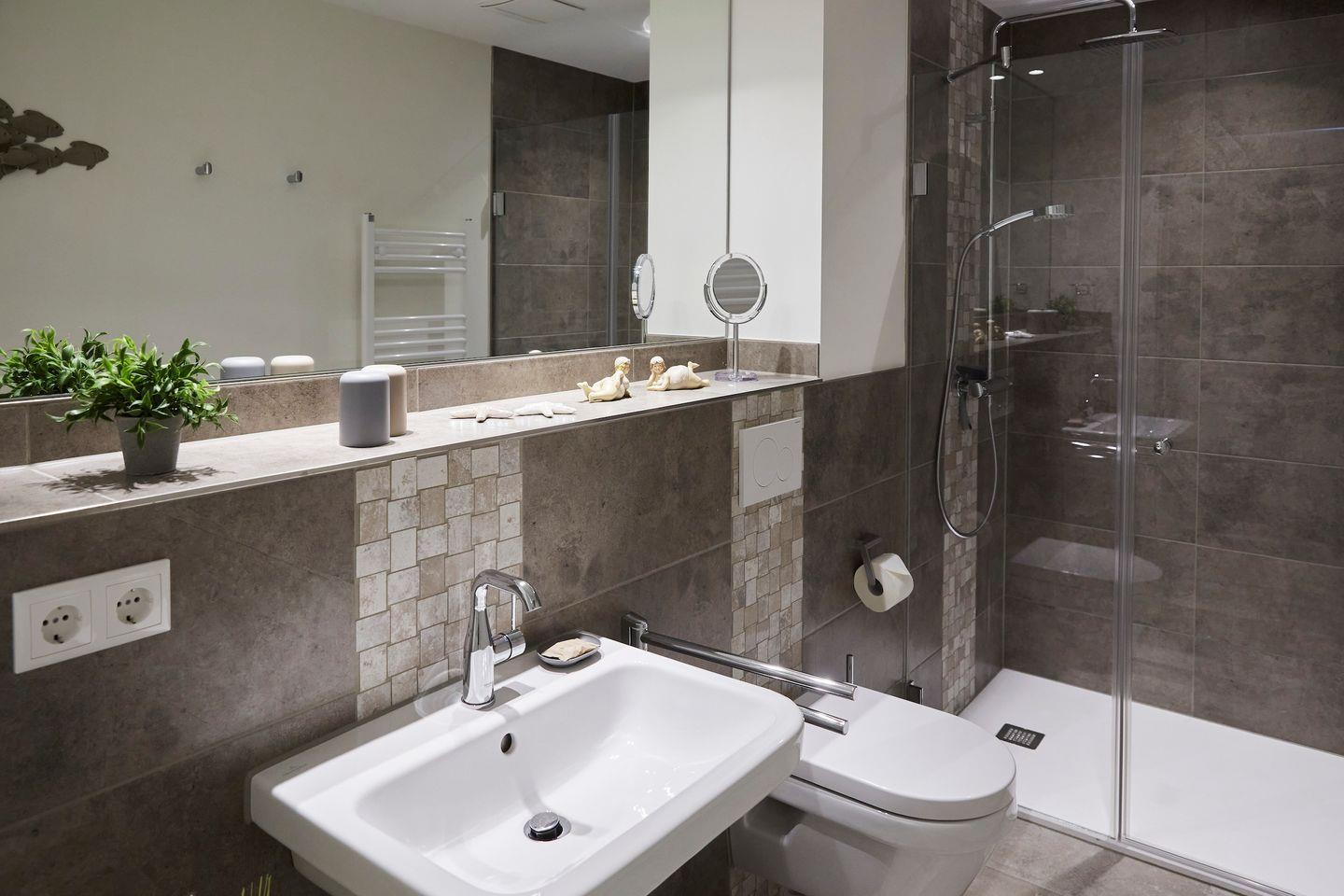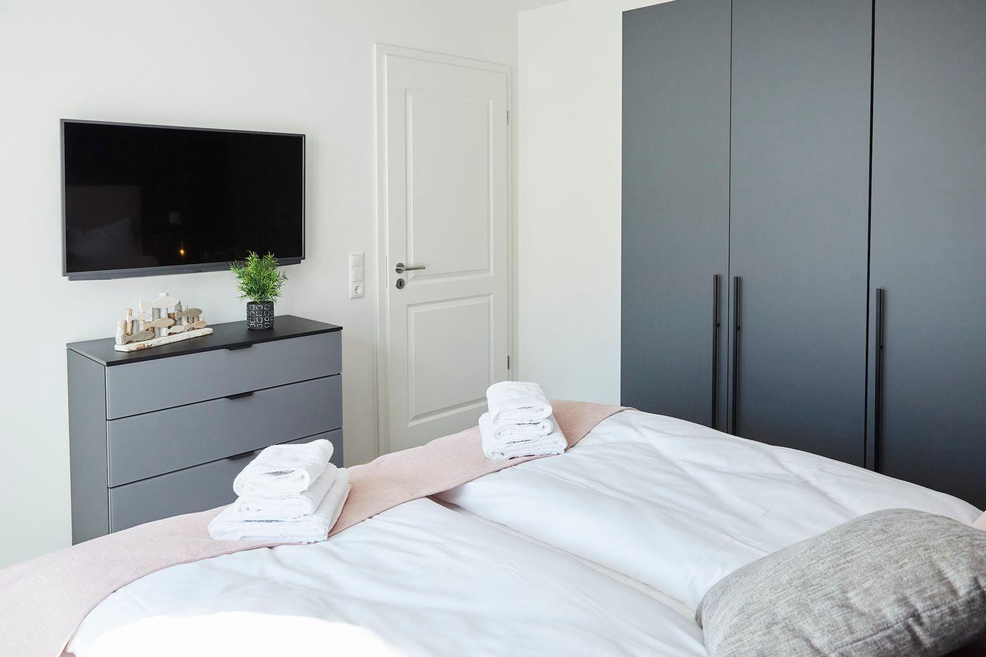 Das Schlafzimmer ist so gestaltet, dass es einen ruhigen Rückzugsort bietet, in dem Sie eine erholsame Nachtruhe genießen können. Es ist mit einem großen, komfortablen Bett ausgestattet, damit Sie nach einem aufregenden Tag am Strand oder beim Erkunden der Umgebung bestens entspannen können. Das Badezimmer verfügt u.a. über eine moderne Dusche sowie nützliche Annehmlichkeiten wie einen Haartrockner und einen Kosmetikspiegel.