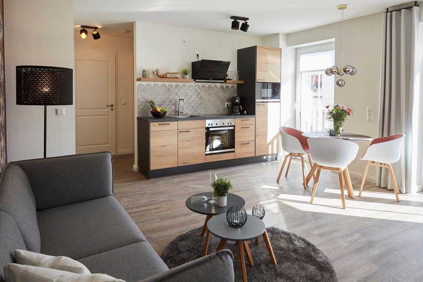 Das 2022 neu errichtete Apartment befindet sich im ersten Stock und ist bequem über einen Aufzug zu erreichen. Beim Betreten des Kattegat Apartments 11 werden Sie sofort von der modernen Ausstattung und dem durchdachten Design begeistert sein. Der offene Wohnbereich ist mit einer gemütlichen Sofaecke ausgestattet, die zum Entspannen nach einem erlebnisreichen Tag einlädt. Ein Essbereich mit einem stilvollen Esstisch bietet den perfekten Platz für gemeinsame Mahlzeiten und gesellige Abende.