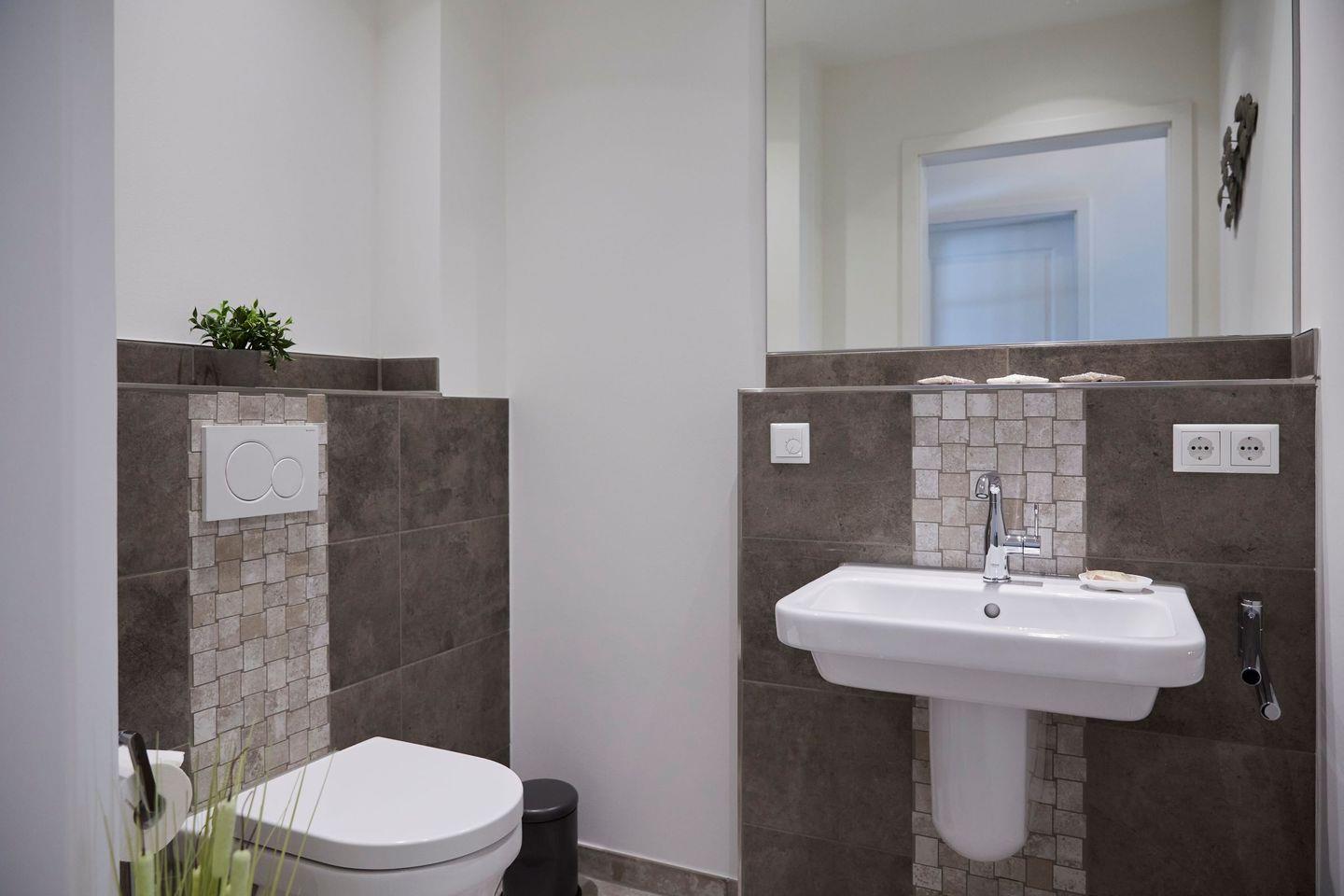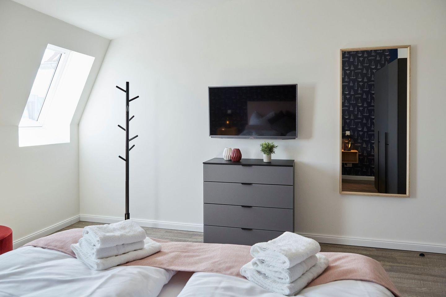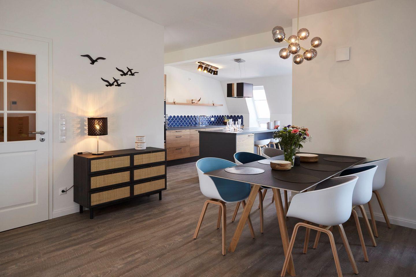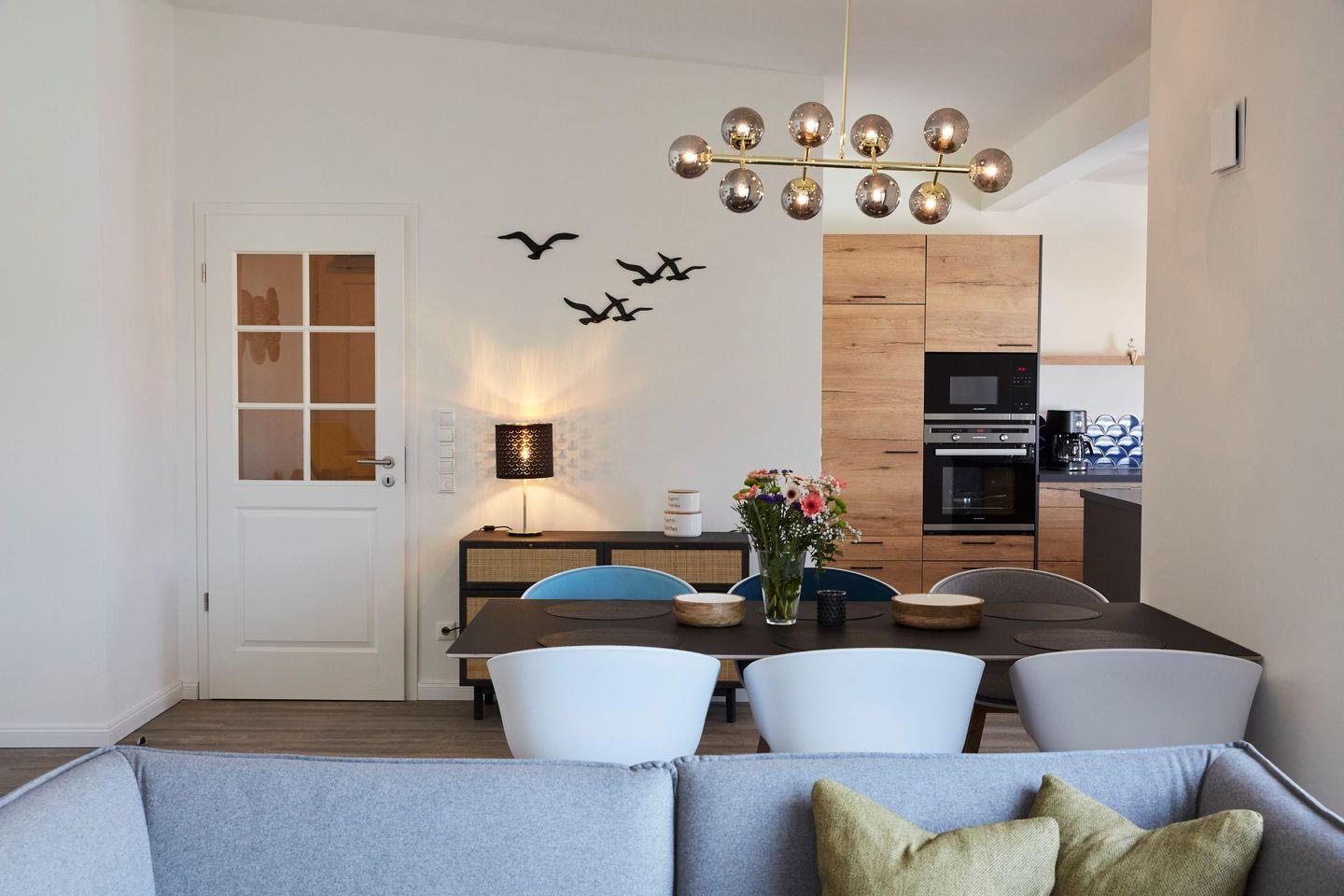 Das Apartment verfügt über drei geschmackvoll eingerichtete Schlafzimmer, die eine erholsame Nachtruhe garantieren. Die zwei Badezimmer sind mit modernen Duschen ausgestattet und bieten zusätzlichen Komfort für alle Gäste. Darüber hinaus punktet die Wohnung mit einer offenen Küche, die zum Wohnzimmer hin gestaltet ist. Die hochwertige Ausstattung umfasst unter anderem einen Herd, ein Cerankochfeld, eine Spülmaschine, einen Kühlschrank mit Gefrierfach sowie kleinere Küchenhelfer wie eine Kaffeemaschine, einen Wasserkocher und eine Mikrowelle. Hier können Sie Ihre Lieblingsgerichte zubereiten und diese in geselliger Runde am Esstisch genießen.