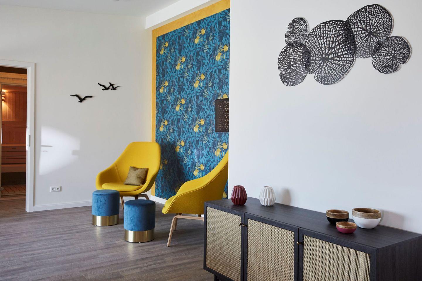 Das helle Wohnzimmer lädt mit einer Sofaecke und einem Esstisch zum Verweilen ein. Hier können Sie entspannen, eine Tasse Tee oder Kaffee genießen und die Zeit mit Ihren Liebsten verbringen. Für Ihre Unterhaltung sorgen vier Fernseher sowie ein Radio.