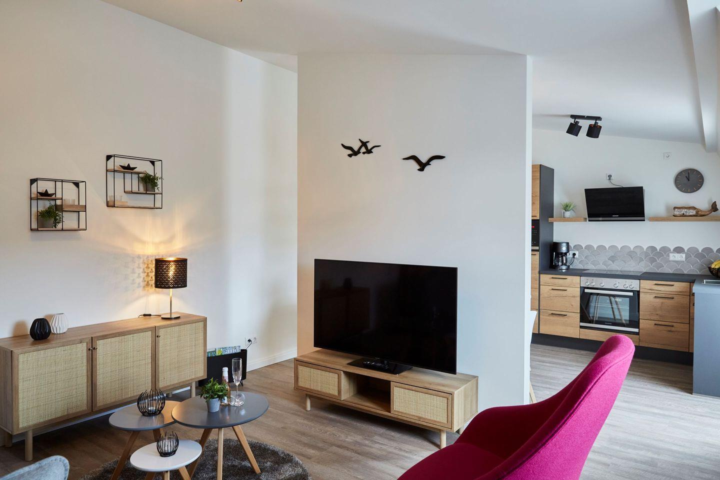 Mit einer Fläche von 51 m² bietet das Apartment ausreichenden Platz für bis zu zwei Personen. Es ist komplett ausgestattet und eignet sich hervorragend für Paare oder alleinreisende Gäste, die das maritime Flair und die vielfältigen Freizeitmöglichkeiten in Büsum entdecken möchten. Das Apartment verfügt über ein Schlafzimmer mit einem gemütlichen Bett, ein modernes Badezimmer mit Dusche sowie ein offenes Wohnkonzept, das das Wohnzimmer mit einer voll ausgestatteten Küche verbindet. Genießen Sie die Vorzüge einer offenen Küche, die mit einem Cerankochfeld, einem Backofen, einer Mikrowelle, einer Spülmaschine, einem Kühlschrank mit Gefrierfach und einer Kaffeemaschine ausgestattet ist. Alle notwendigen Küchenutensilien, Geschirr und Besteck stehen ebenfalls zur Verfügung, sodass Sie in der Lage sind, sich Ihre Mahlzeiten selbst zuzubereiten.