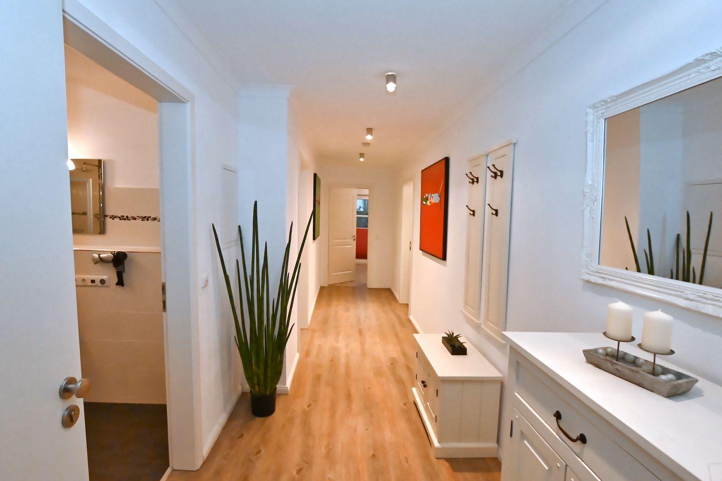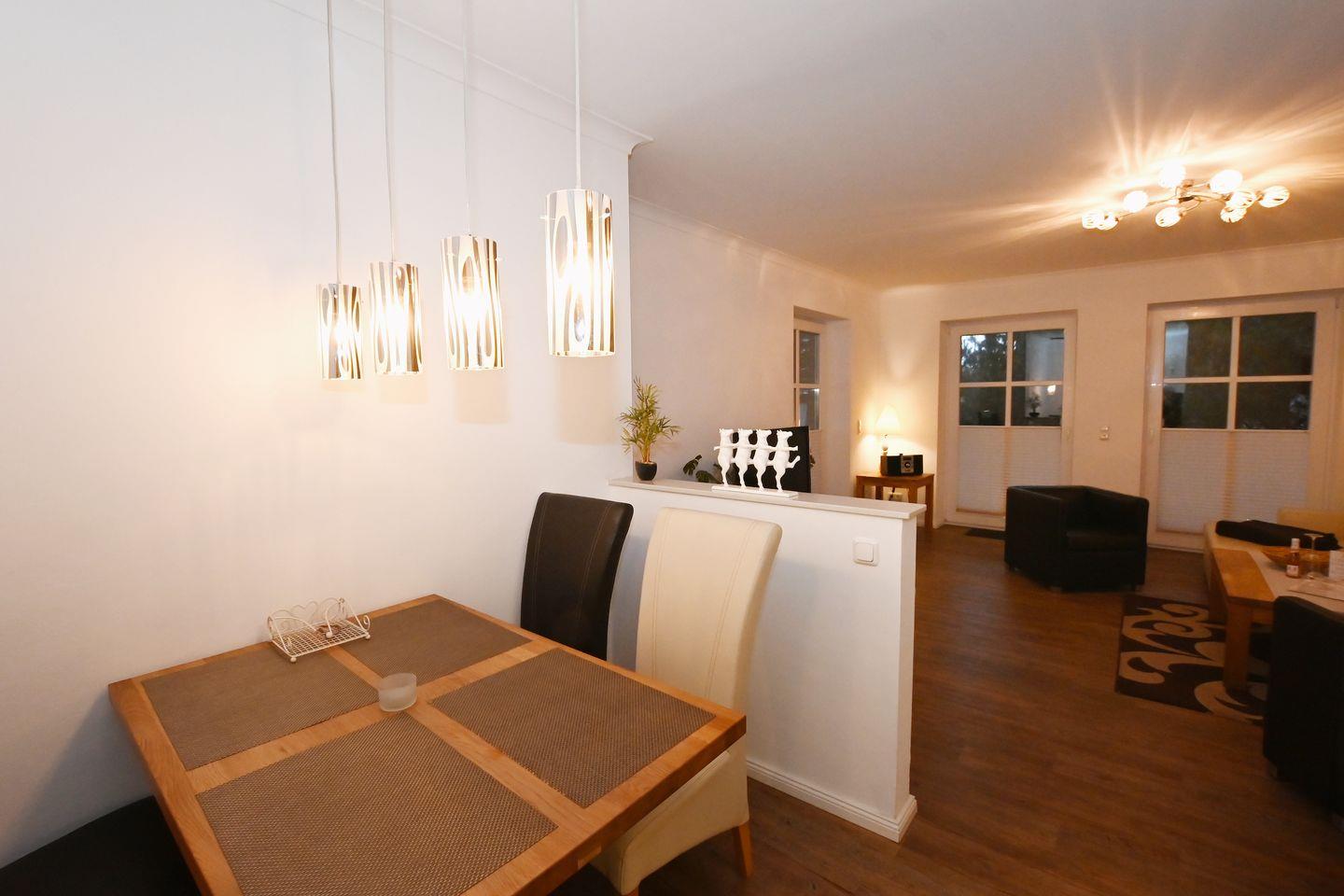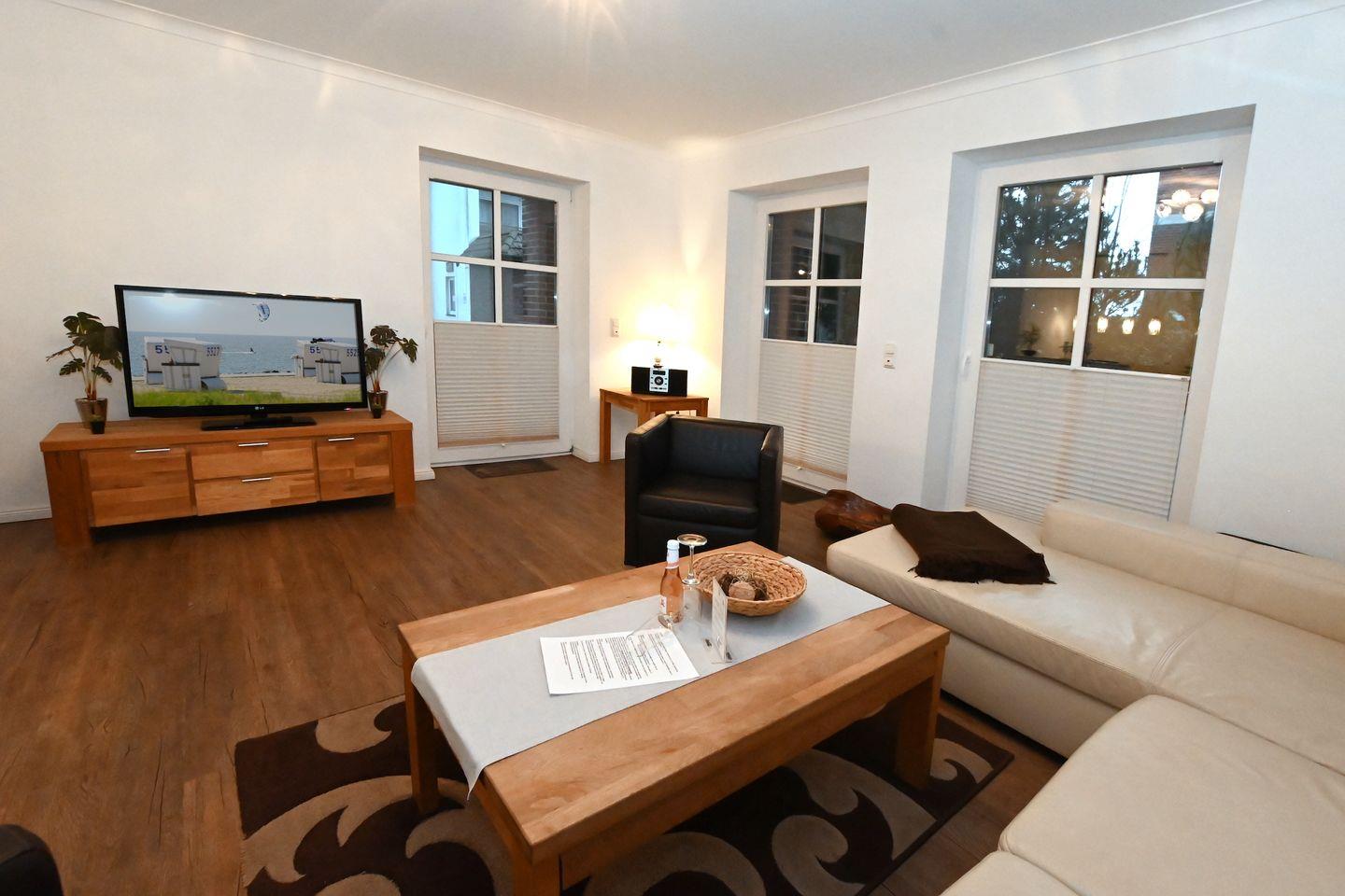 Die Ferienwohnung befindet sich im Parterre und beeindruckt durch ihre moderne, offene Gestaltung. Der Wohnbereich ist sowohl gemütlich als auch funktional eingerichtet und umfasst eine Sofaecke mit einem großen Sofa sowie einem gemütlichen Sessel, ideal zum Entspannen nach einem erlebnisreichen Tag am Strand. Ein Fernseher sorgt für Unterhaltung und gemütliche Filmabende im Kreise Ihrer Liebsten.