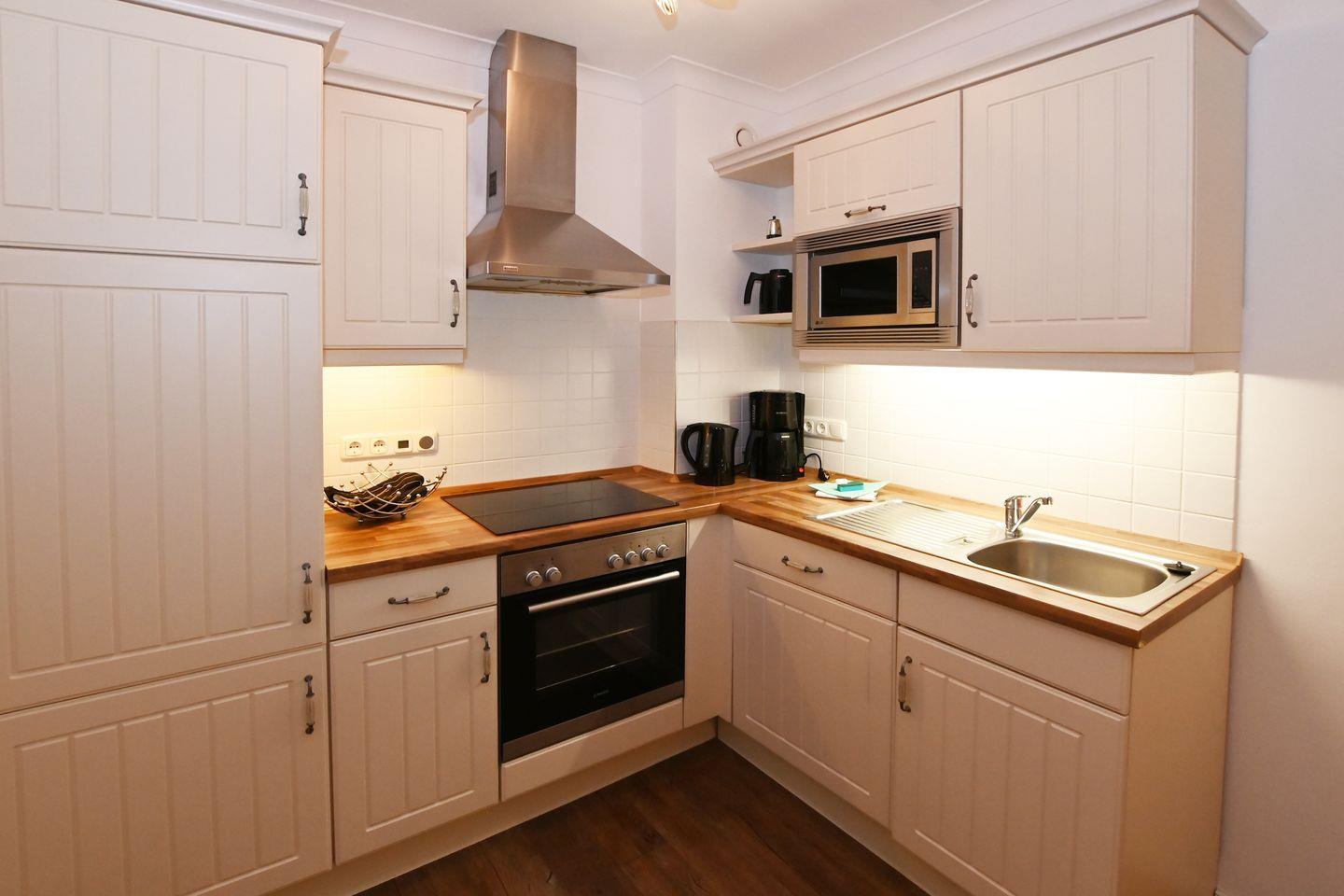 Die offene Küche, die elegant in den Wohnraum integriert ist, ist mit allen erforderlichen modernen Annehmlichkeiten ausgestattet. Hierzu zählen ein Herd, ein Backofen, eine Spülmaschine und eine Mikrowelle, um nur einige Einrichtungen zu nennen. Darüber hinaus stehen Ihnen ein Kühlschrank mit Gefrierfach, ein Toaster, sowie eine Kaffeemaschine zur Verfügung.