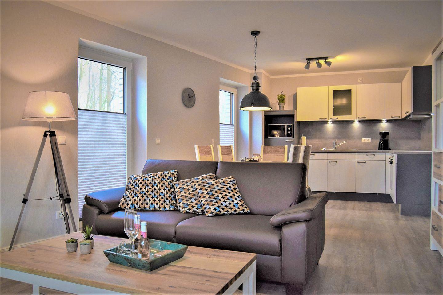 Das Apartment verfügt über zwei separate Schlafzimmer mit bequemen Schlafmöglichkeiten und einen großzügigen Wohn- und Essbereich, der zum Verweilen einlädt. Die offene Küche ist optimal in den Wohnraum integriert und vollständig ausgestattet: Hier finden Sie unter anderem einen Backofen, eine Mikrowelle, einen Herd, einen Kühlschrank mit Gefrierfach, eine Spülmaschine sowie umfangreiche Kochutensilien, um auch im Urlaub nicht auf kulinarische Genüsse verzichten zu müssen. Ein Wasserkocher, eine Kaffeemaschine und ein Toaster stehen ebenfalls zur Verfügung.