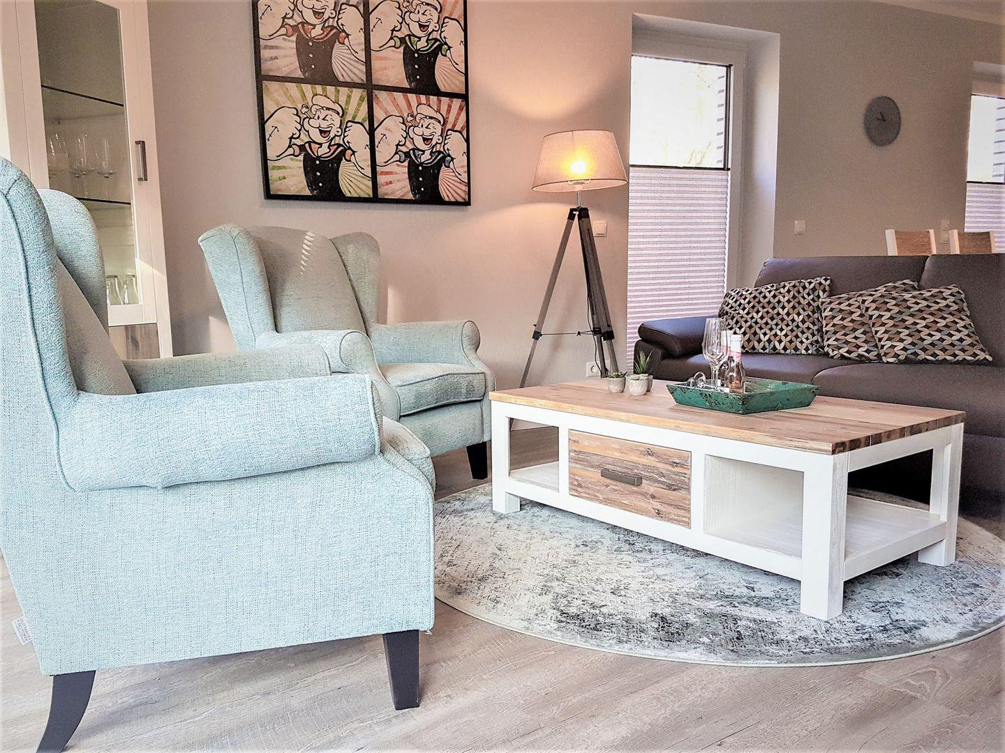 Im lichtdurchfluteten Wohnbereich erwarten Sie eine gemütliche Sofaecke, ein Sessel, ein Esstisch und drei Fernseher, die für Unterhaltung sorgen. WLAN steht im gesamten Apartment zur Verfügung. Die bodentiefen Fenster schaffen ein freundliches Ambiente und ermöglichen den direkten Zugang zur möblierten Terrasse.