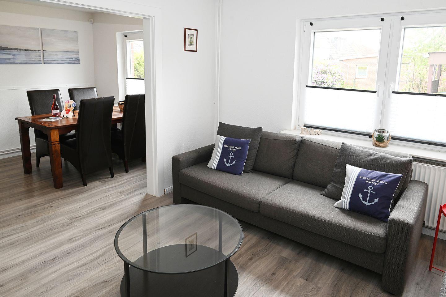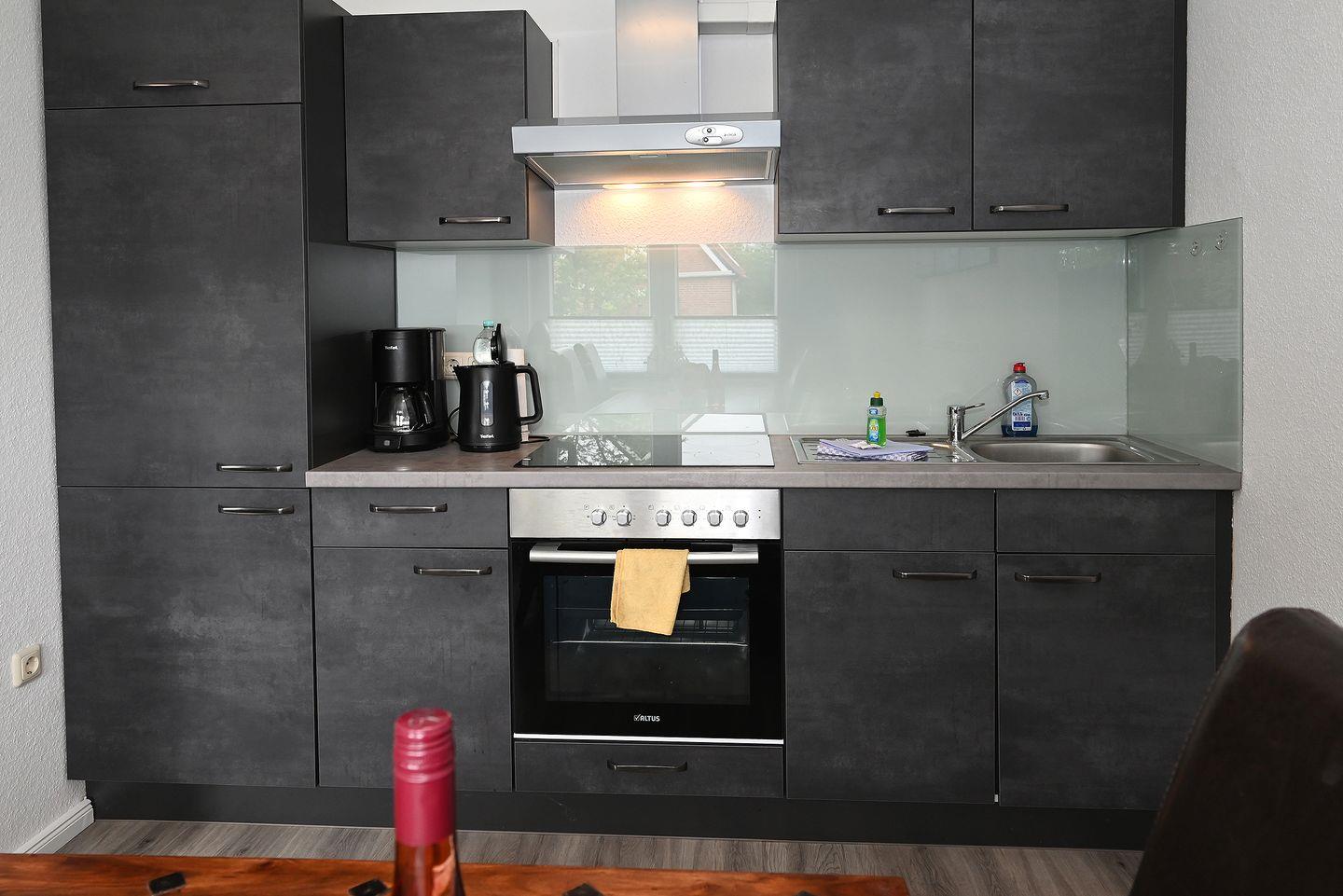Der offene Koch- und Essbereich ist komplett ausgestattet und lädt zum gemeinsamen Kochen und Genießen ein. Direkt angrenzend befindet sich der Wohnraum mit bequemen Sitzecke- perfekt für entspannte Abende oder gesellige Stunden.