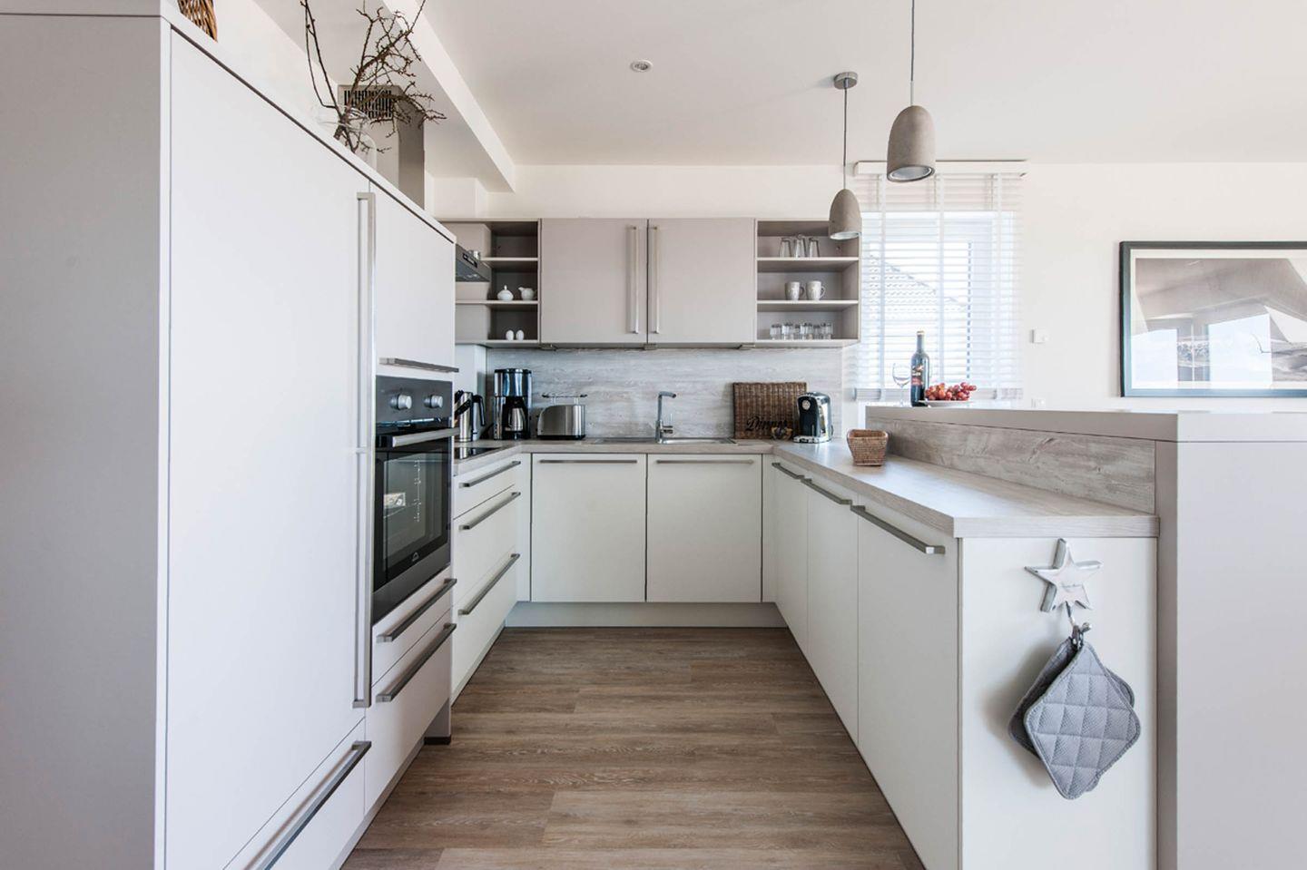 Küchenzeile: Geschirrspüler, Cerankochfeld, Mikrowelle, Backofen, Kühlschrank mit Gefrierfach.