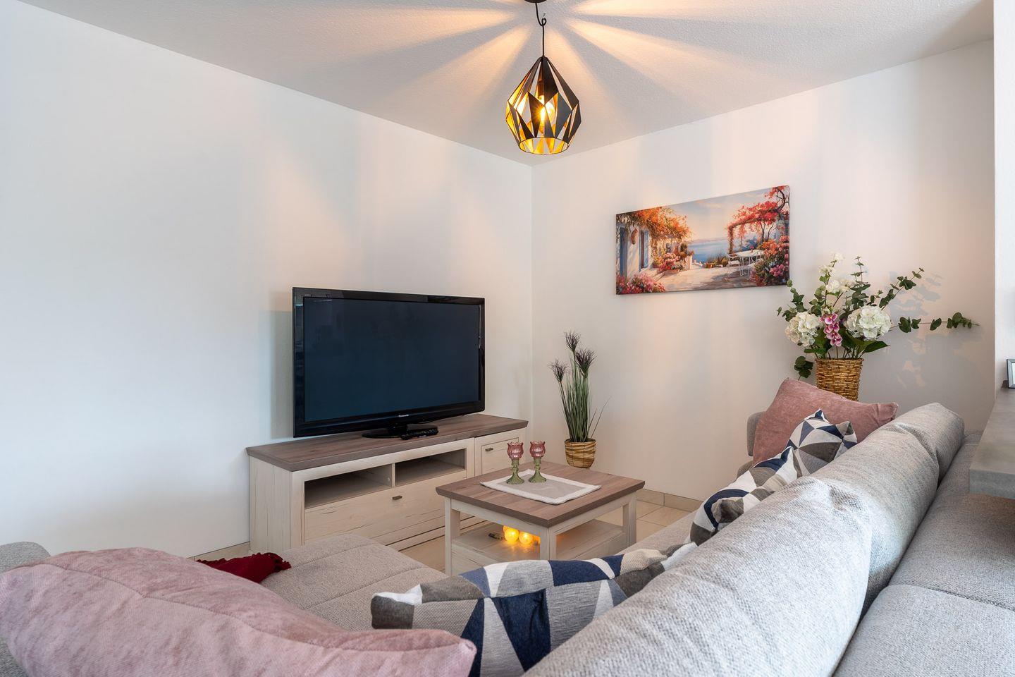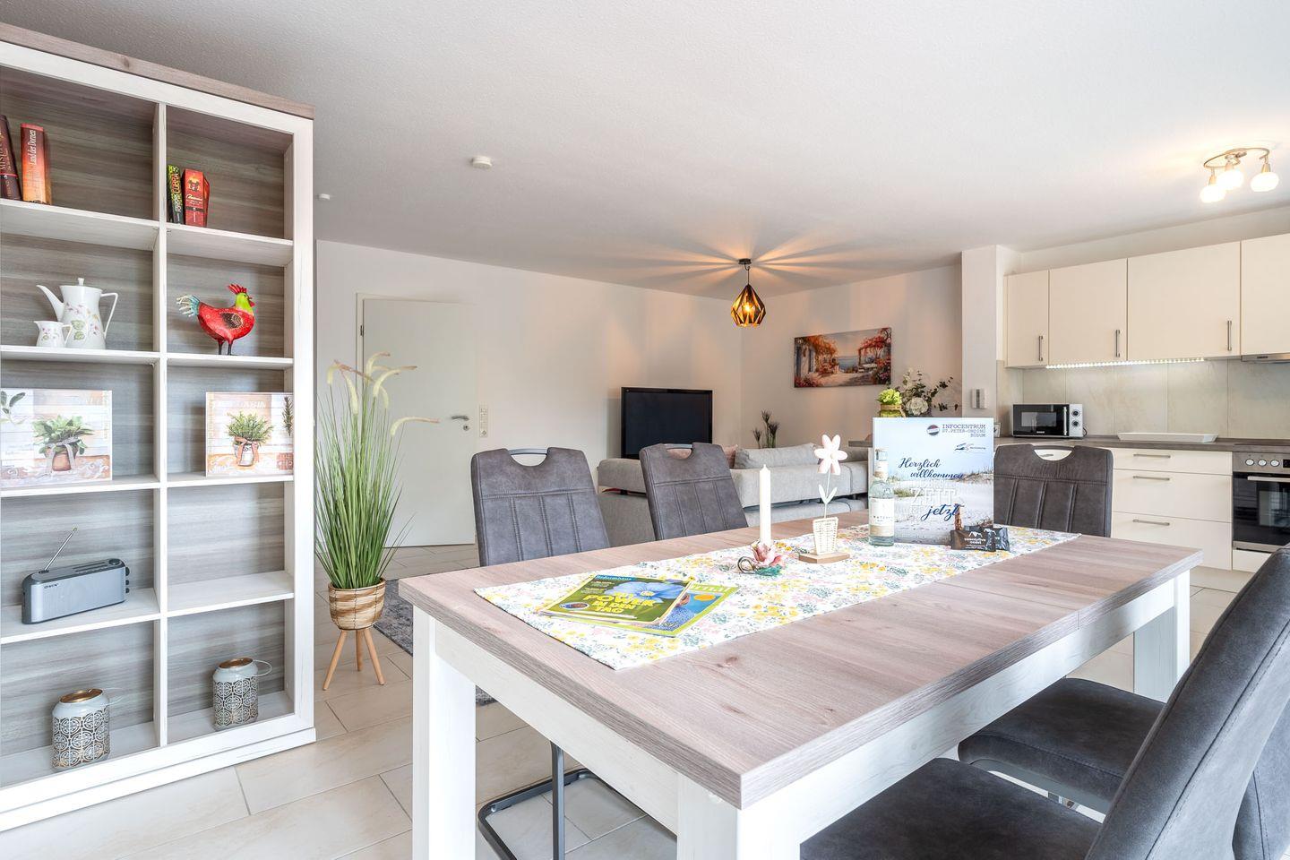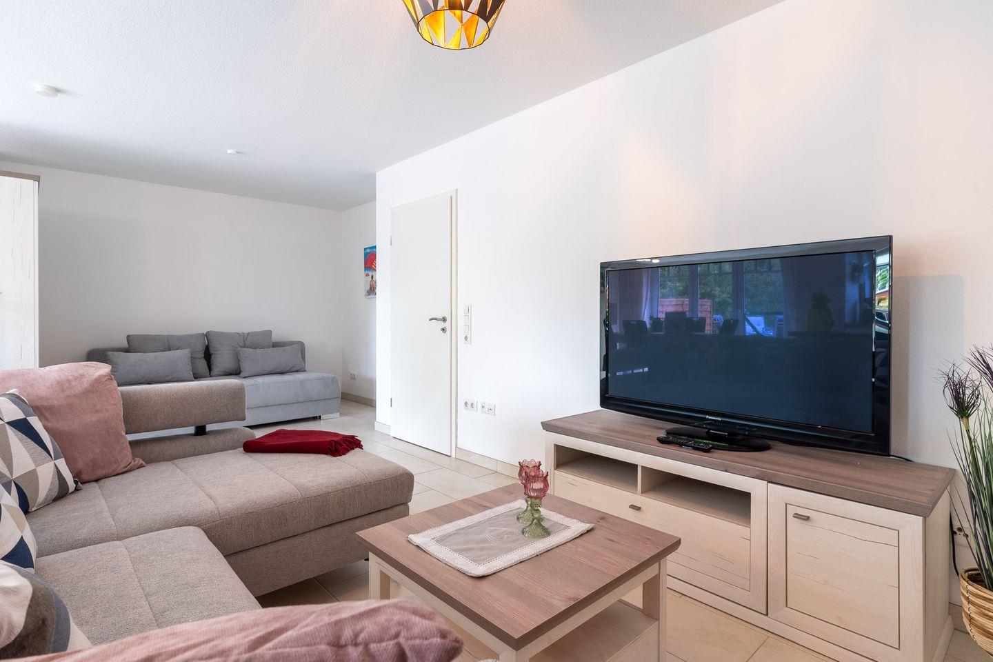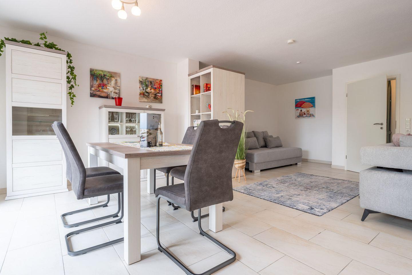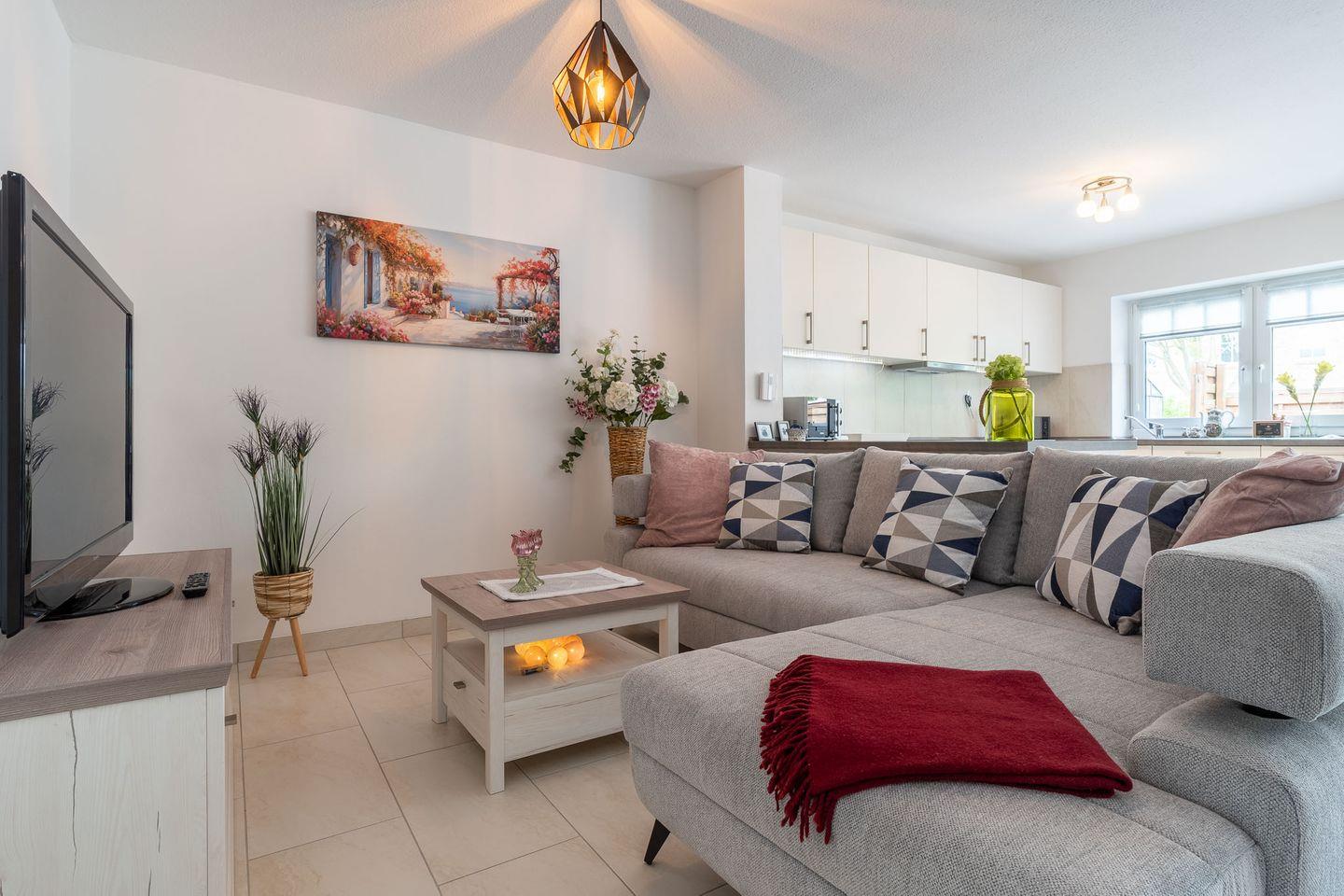Die Erholungs-Oase beherbergt insgesamt drei Zimmer, darunter ein einladendes Schlafzimmer (1 Doppelbett 180x200,1 Einzelbett 90x200) das mit einem gemütlichen Fliesenboden ausgestattet ist. Das Wohnzimmer zeigt sich hell und freundlich und bietet ausreichend Platz zum Entspannen. Eine Sofaecke (Schlafsofa 160x200), ein Esstisch und ein Fernseher mit Radioempfang zeichnen den Wohnbereich aus. Hier können Sie nach einem ereignisreichen Tag am Strand zur Ruhe kommen oder gesellige Abende mit Ihren Lieben verbringen.