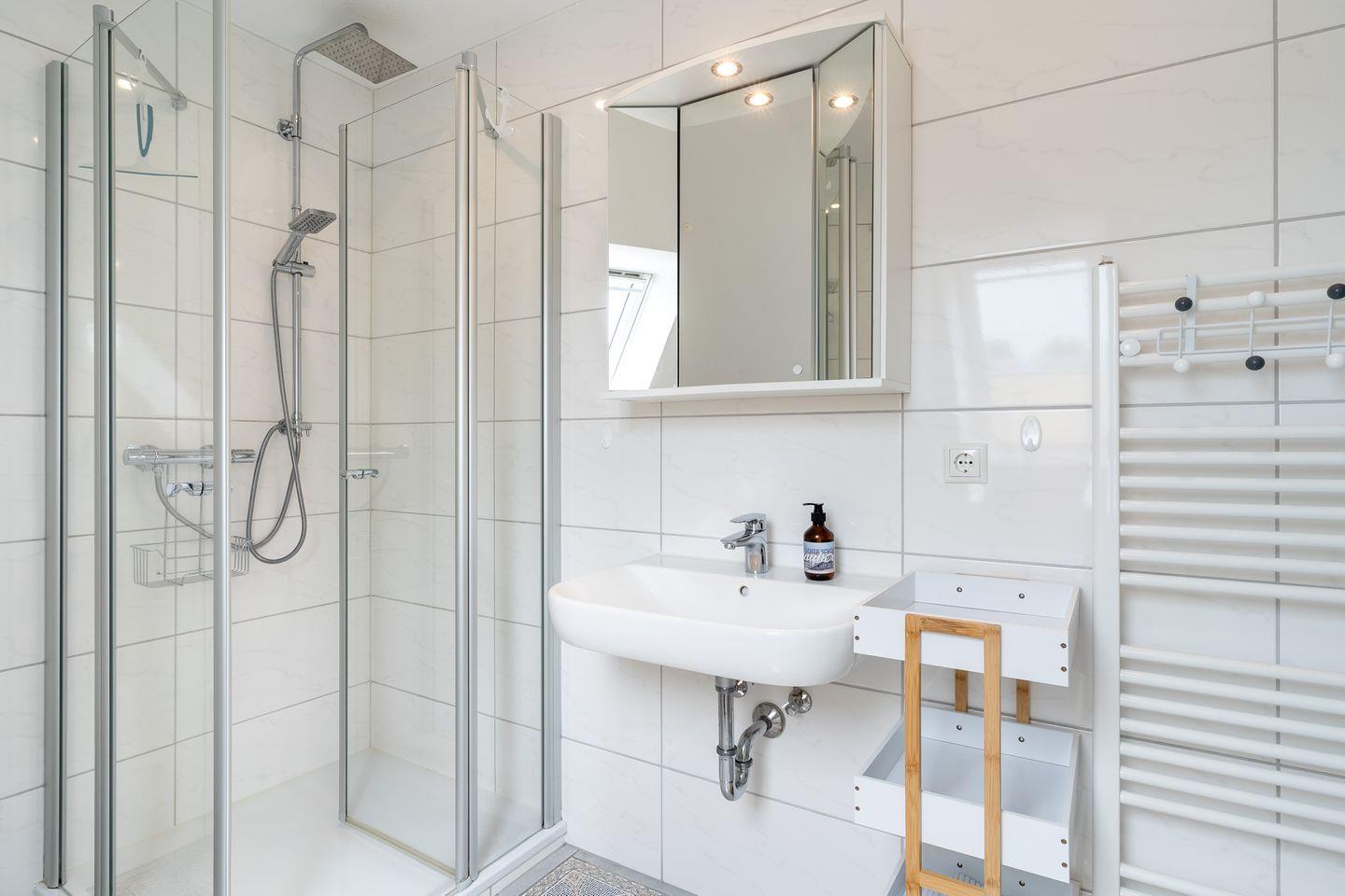 Die Unterkunft bietet ein modernes Badezimmer mit bodengleicher Dusche, Waschbecken, WC und Kosmetikspiegel. Ein Gäste-WC steht ebenfalls zur Verfügung. Für zusätzlichen Komfort sorgen ein Haartrockner und ein Wäscheständer. Dank der durchdachten Ausstattung wie Fliegengitter, Fenster mit Sichtschutz, Rauchmelder und einem praktischen Schuhschrank fühlen Sie sich schnell wohl und sicher.