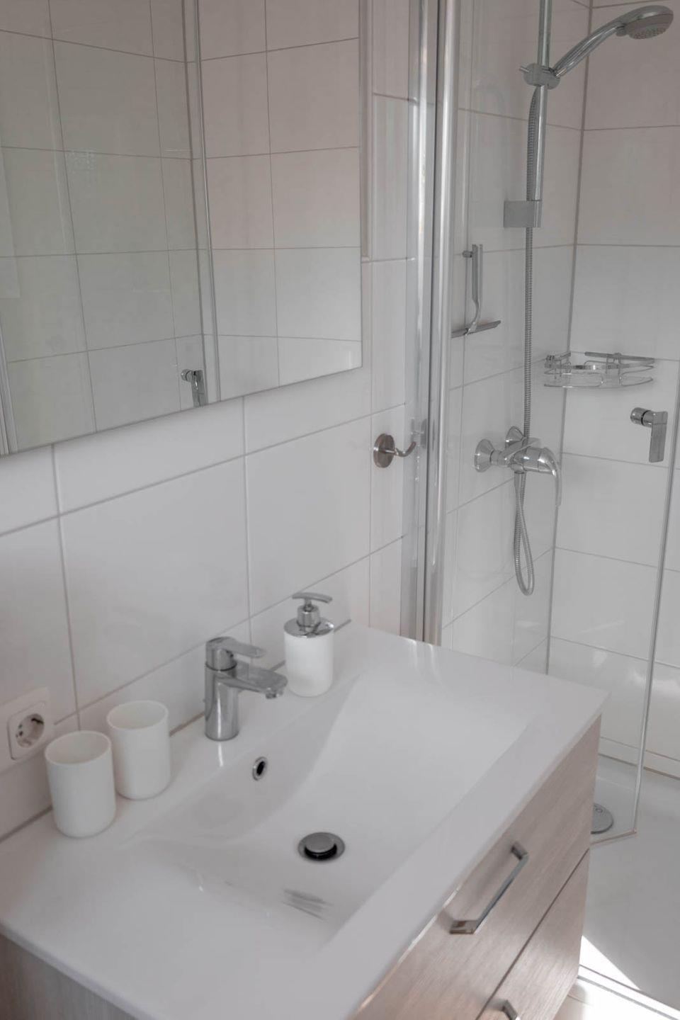 Die offene Küche ist zum Wohnzimmer hin ausgerichtet und verfügt über eine hochwertige Ceran-Kochfläche, einen Backofen, einen Kühlschrank sowie eine Spülmaschine. Ergänzt wird die Küchenausstattung durch eine Kaffeemaschine, einen Toaster, einen Wasserkocher sowie sämtliche notwendigen Küchenutensilien, Geschirr und Besteck. Ein Esstisch im Essbereich eignet sich ideal für gemeinsame Mahlzeiten.