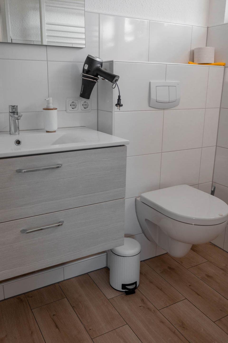 Das Badezimmer präsentiert sich mit einer bodengleichen XL Dusche, WC, Waschbecken, Spiegel und Kosmetikspiegel sowie einem Haartrockner.