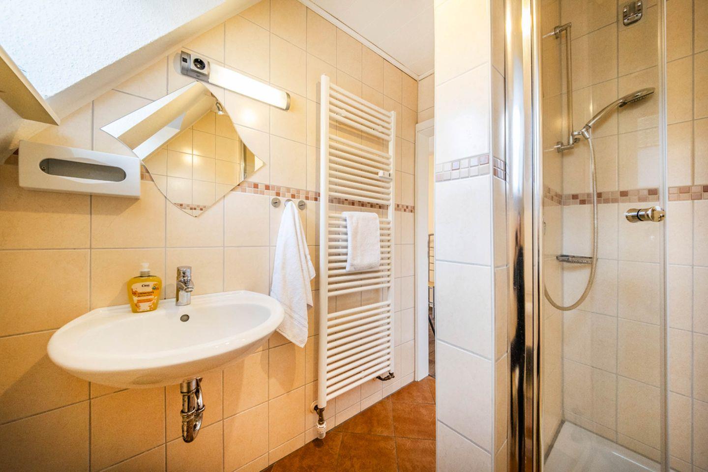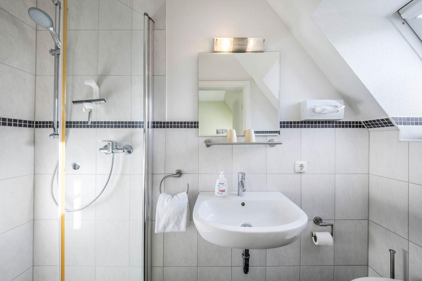 Die Bäder sind modern gestaltet und mit bodengleicher Dusche versehen. Ein Haartrockner steht zur Verfügung. Die Nutzung einer Waschmaschine und eines Trockners ist ab dem Winter 2025 gemeinschaftlich geregelt und Ihnen steht im Haus Köhler (Regenpfeiferweg 5) der Zugang zum Waschraum zur Verfügung.