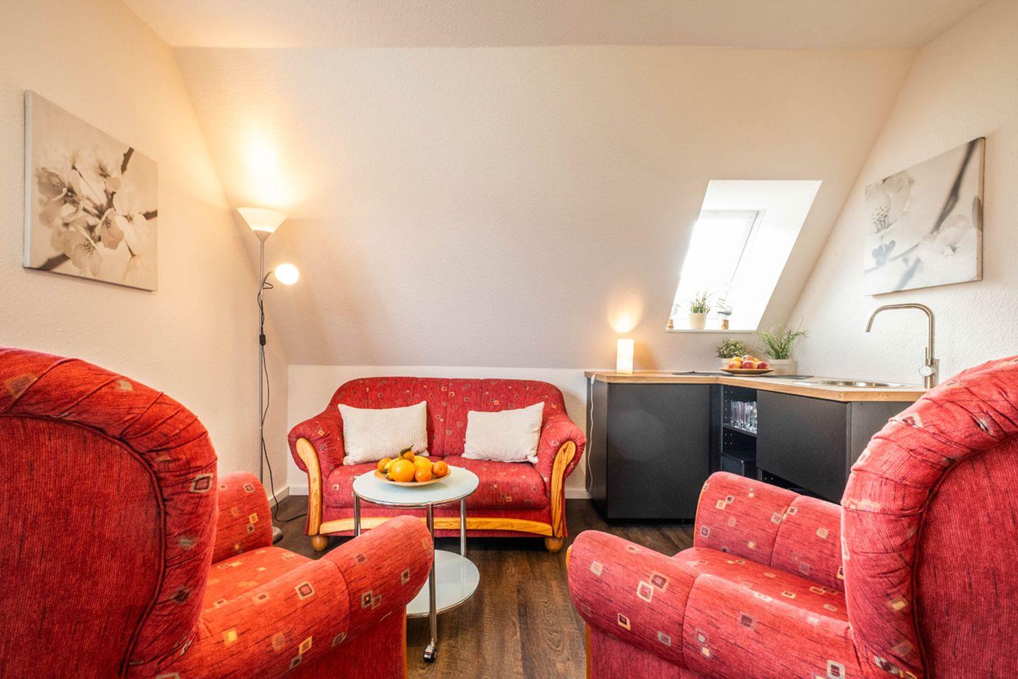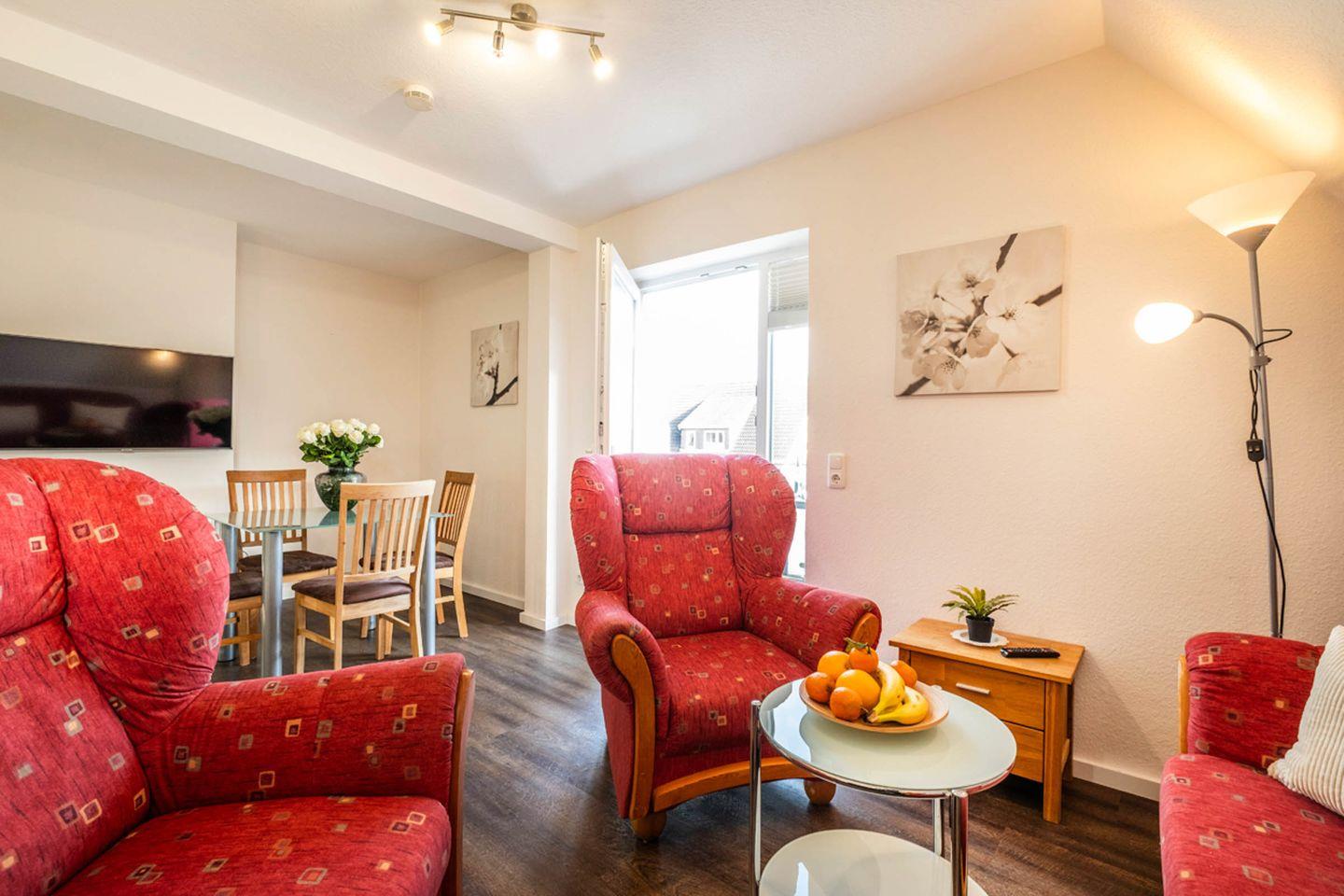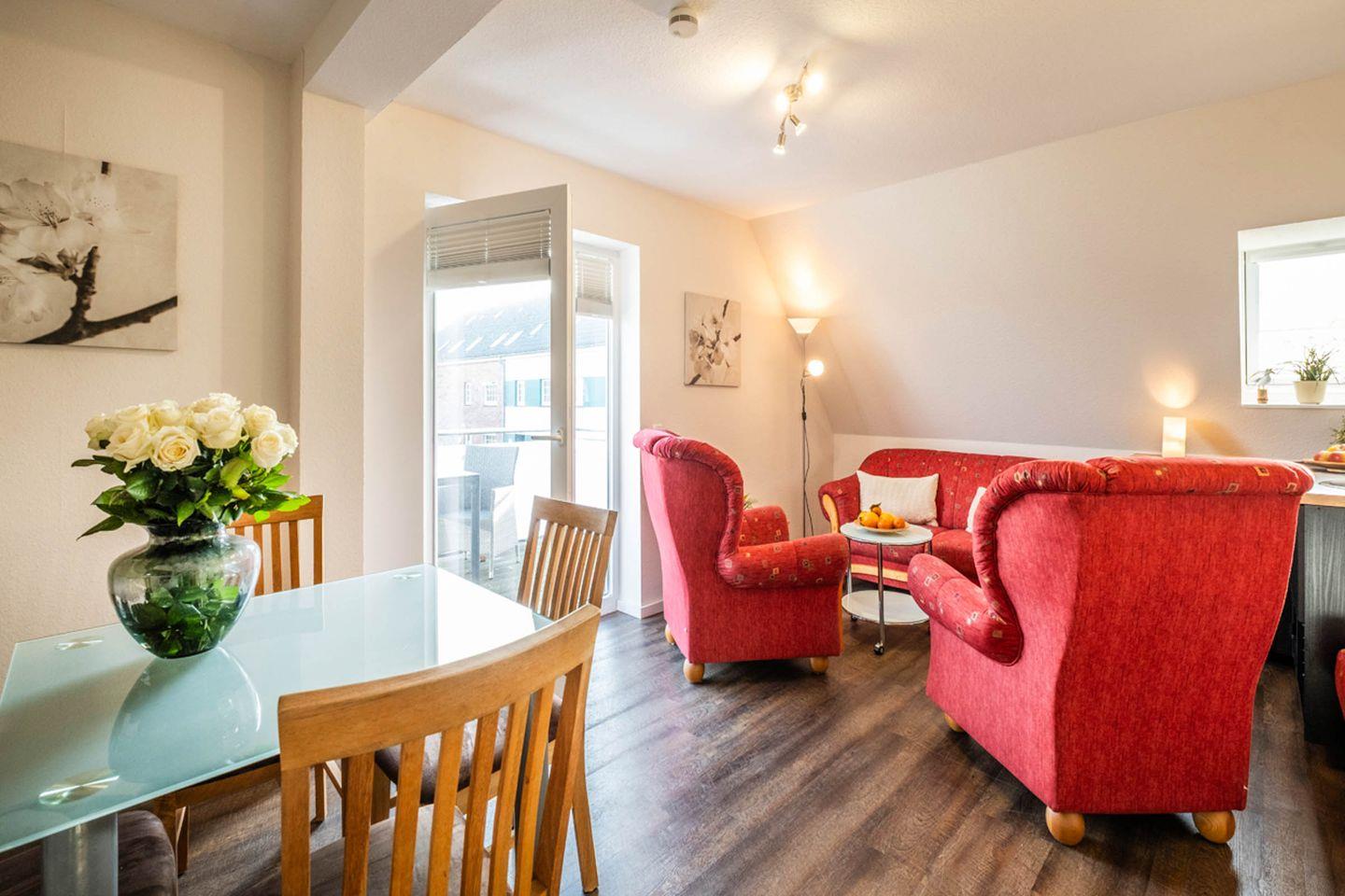 Im Wohnzimmer erwartet Sie eine gemütliche Sofaecke mit zusätzlichem Sessel. Der Essbereich mit Esstisch schafft einen angenehmen Rahmen für gemeinsame Mahlzeiten. Die offene, voll ausgestattete Küche ist zum Wohnzimmer hin ausgerichtet und verfügt unter anderem über einen Ceran-Herd, Kühlschrank mit Gefrierfach, Mikrowelle, Spülmaschine, Wasserkocher, Kaffeemaschine und Toaster. Hochwertige Küchenutensilien, Geschirr, Besteck und Geschirrhandtücher sind ebenfalls vorhanden, sodass Sie alle Annehmlichkeiten für die Selbstverpflegung genießen können.