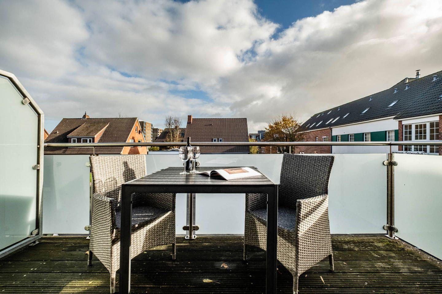Der Balkon im 1. Obergeschoss ist ideal, um die frische Nordseeluft zu genießen oder einen entspannten Tagesausklang zu verbringen. Der zur Wohnung gehörende Parkplatz gewährleistet, dass Sie Ihr Fahrzeug sicher und bequem abstellen können.