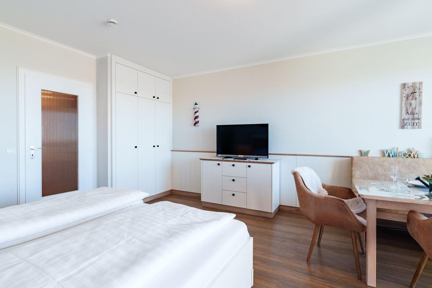 Essplatz mit einer Sitzbank und 2 Sesseln, Flachbild TV, Sideboard, Kleiderschrank 3-türig, Bücher und Spiele, Zugang zum möblierten Balkon (Westlage), Doppeltbett 2 getrennte Matratzen 90cm x 200 cm, ausziehbares Einzelbett für Kinder bis 12 Jahre ( 80cm x 170cm )
