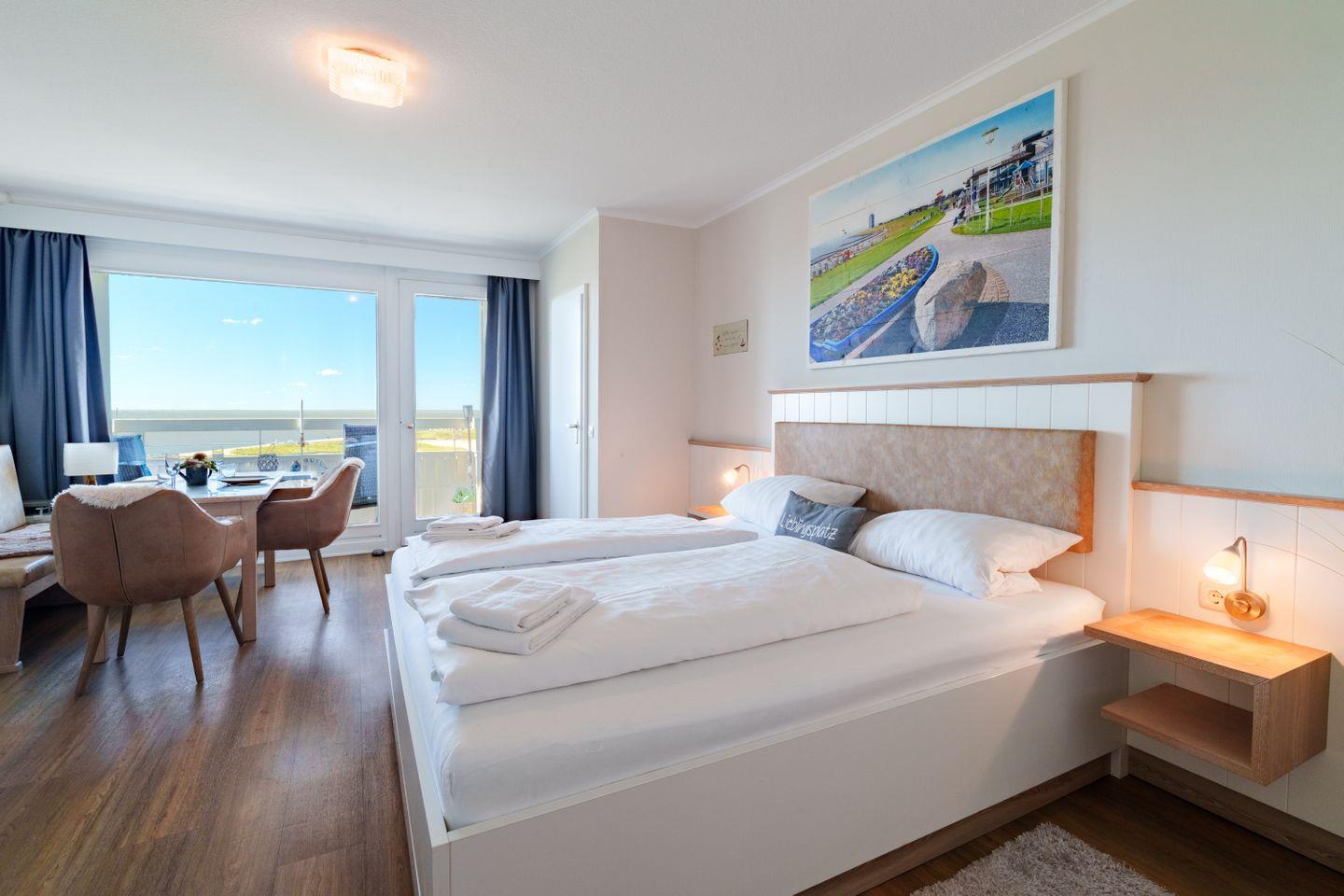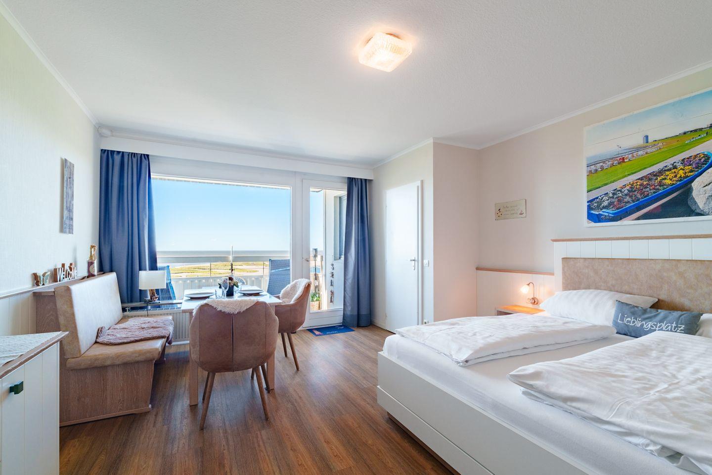 Meerblick über die Familienlagune: Hochhaus Whg. 57 im 5. OG für 2 Personen + 1 Kind mit West-Balkon, Wohn-/Schlafraum und separater Küche, Duschbad, WLAN, Aufzug und Privatparkplatz. Strand 200 m, Meer 100 m, Einkauf 500 m, Innenstadt 800 m, Bahnhof 1,8 km; Kleinbahn-Haltestelle in wenigen Schritten.