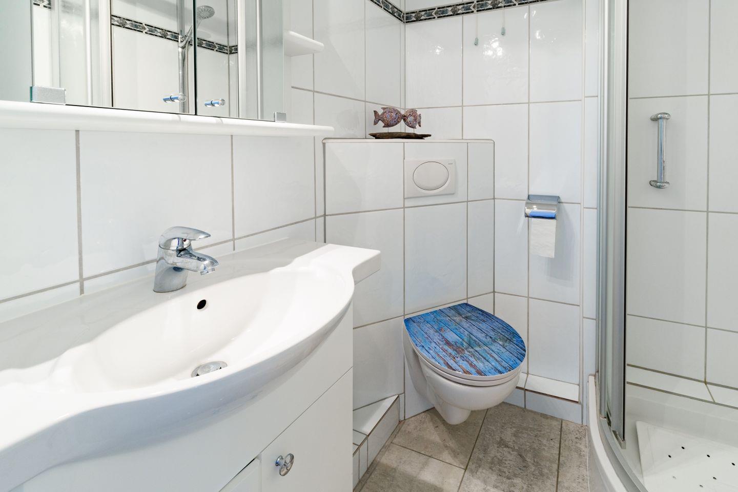 Dusche, Waschbecken, Hocker, Toilette, Spiegel, Föhn, Regal, Abluft