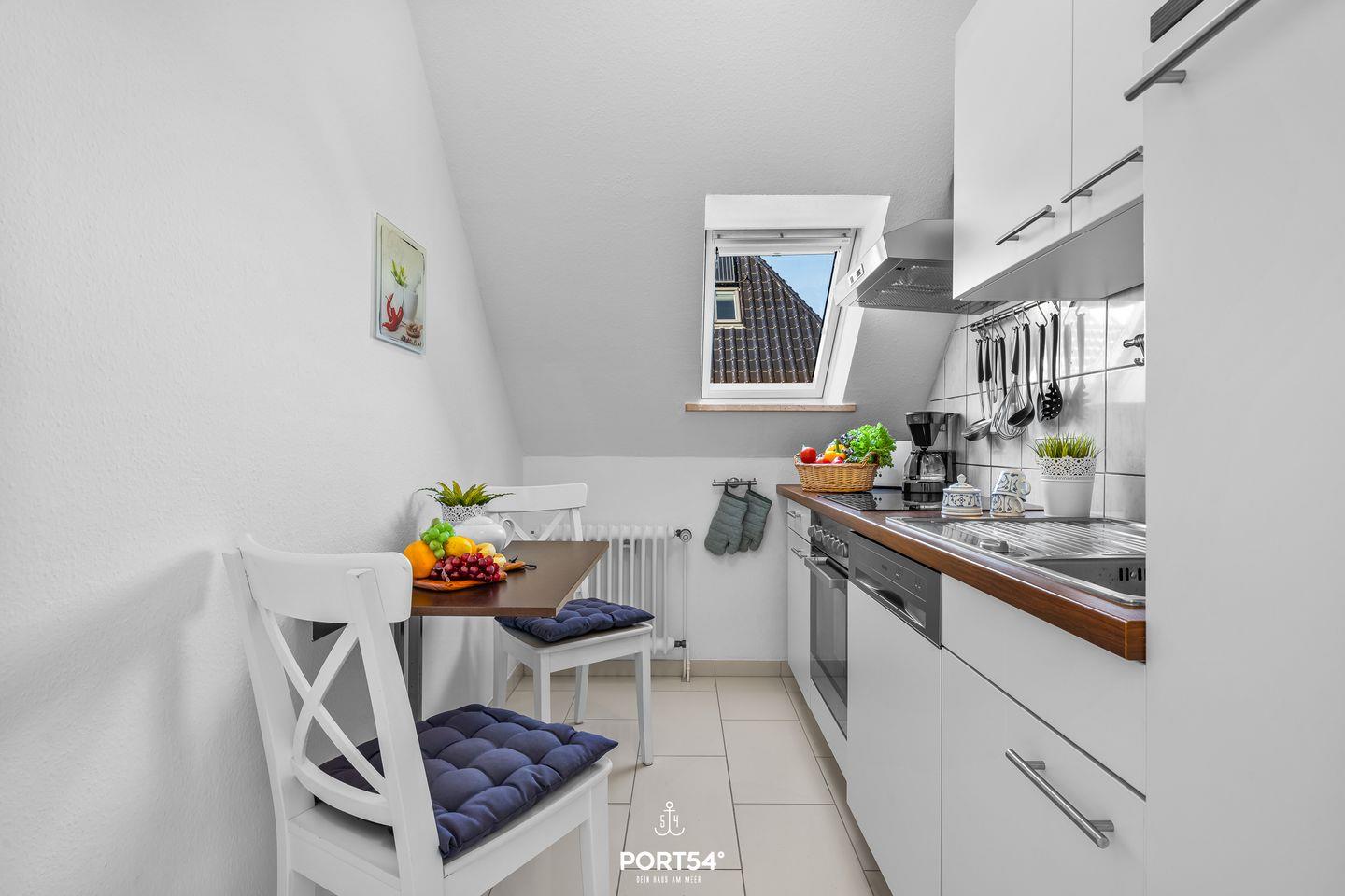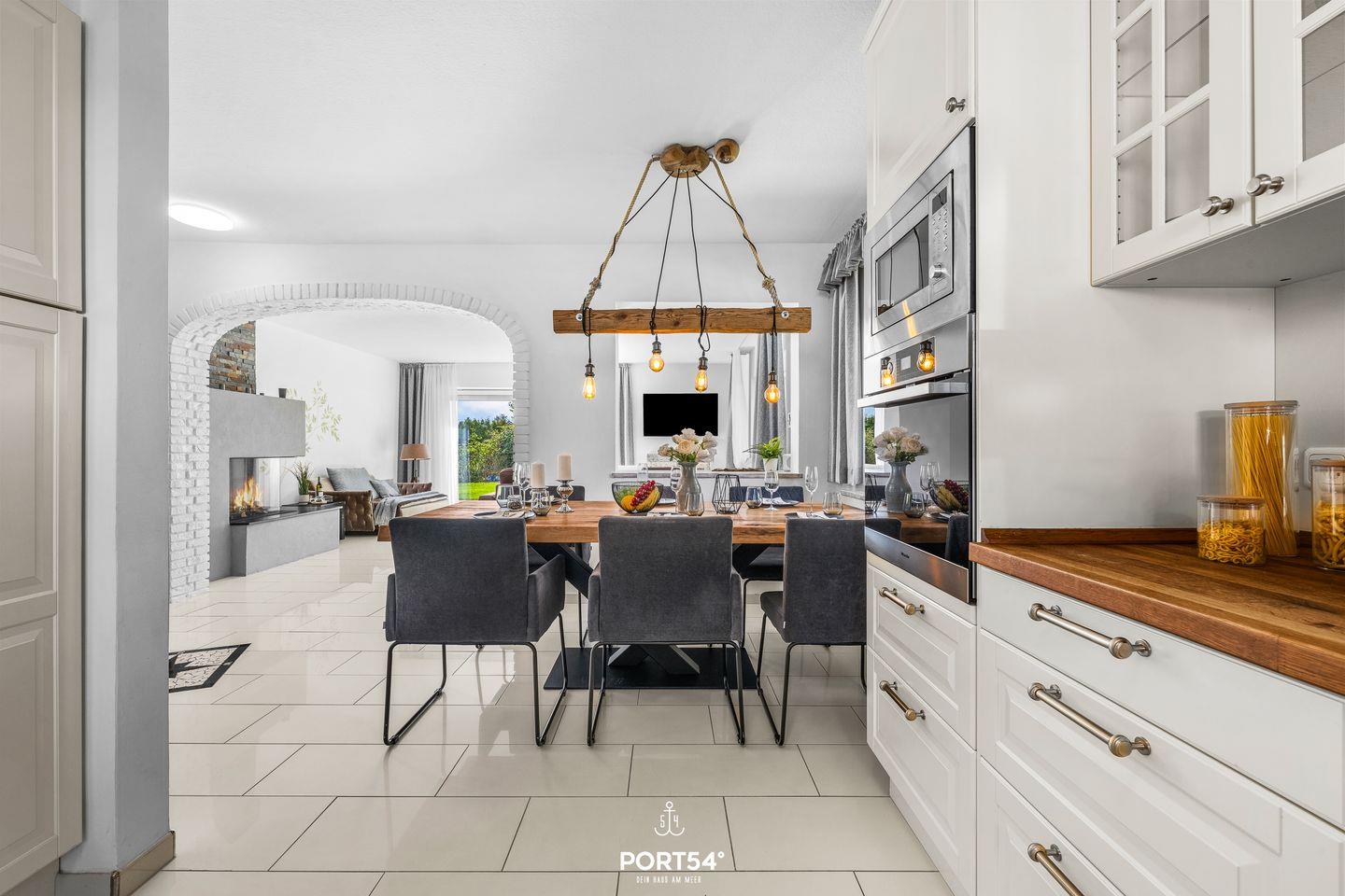 Im Obergeschoss befindet sich zusätzlich eine zweite, voll ausgestattete Küche – ideal für Urlaube mit mehreren Generationen oder befreundeten Paaren, die auch einmal unabhängig voneinander kochen möchten.