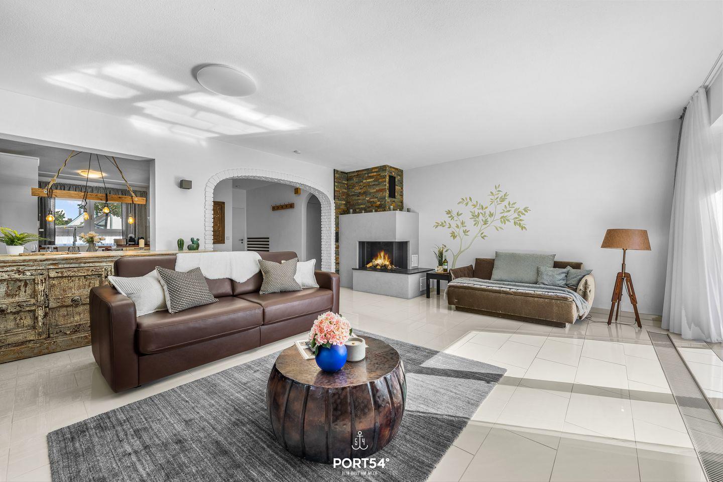 Im Wohnzimmer erwarten Sie eine gemütliche Sofaecke mit Sesseln und ein großer Esstisch für gemeinsame Mahlzeiten. Der Kamin dient dekorativen Zwecken, derzeit ohne Funktion.