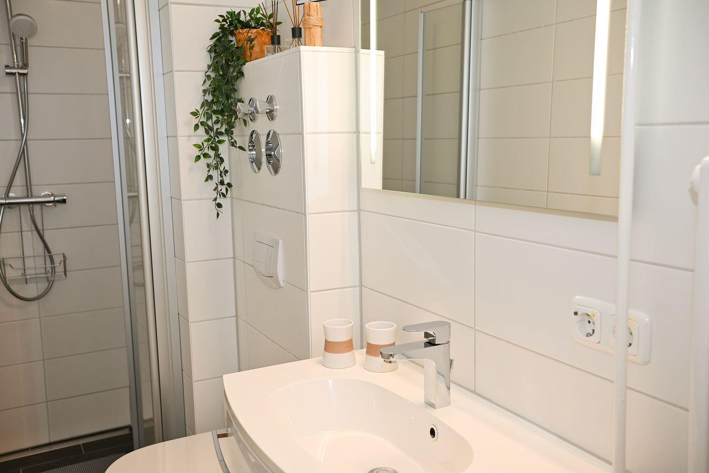 Das moderne Badezimmer ist mit Dusche, Spiegel, Haartrockner und ausreichend Ablageflächen ausgestattet.