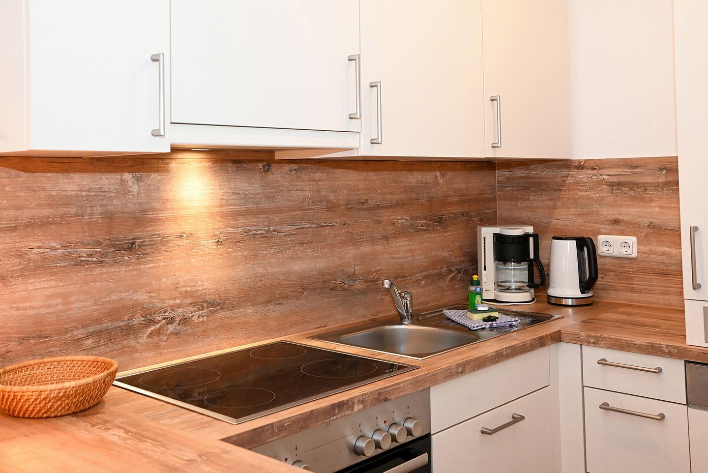 Das separate Schlafzimmer ist mit einem komfortablen Doppelbett in der Größe 1,80 x 2,00 Meter ausgestattet. Für die kleinen Gäste steht ein festes Kinderbettchen bereit, sodass sich auch Familien mit Baby oder Kleinkind rundum wohlfühlen können. Der offene Wohn-, Ess- und Kochbereich lädt zum Entspannen und Verweilen ein. Die moderne Küche verfügt über einen Backofen, ein Ceran-Kochfeld, einen Kühlschrank mit Gefrierfach sowie alle wichtigen Küchenutensilien, um im Urlaub gemeinsam zu kochen und zu genießen.