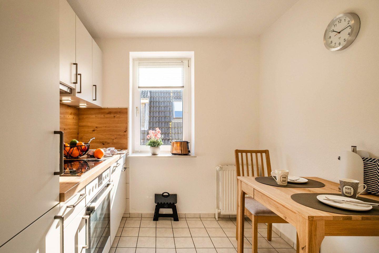 Die Küche ist geschlossen und verfügt über einen Esstisch mit Essbereich – praktisch, wenn Sie Mahlzeiten in Ruhe zubereiten und gemeinsam essen möchten. Zur Ausstattung gehören Ceran-Herd, Backofen, Kühlschrank, Spülmaschine, Wasserkocher, Toaster sowie Küchenutensilien, Geschirr und Besteck. Geschirrhandtücher und Abfalleimer sind ebenfalls vorhanden.