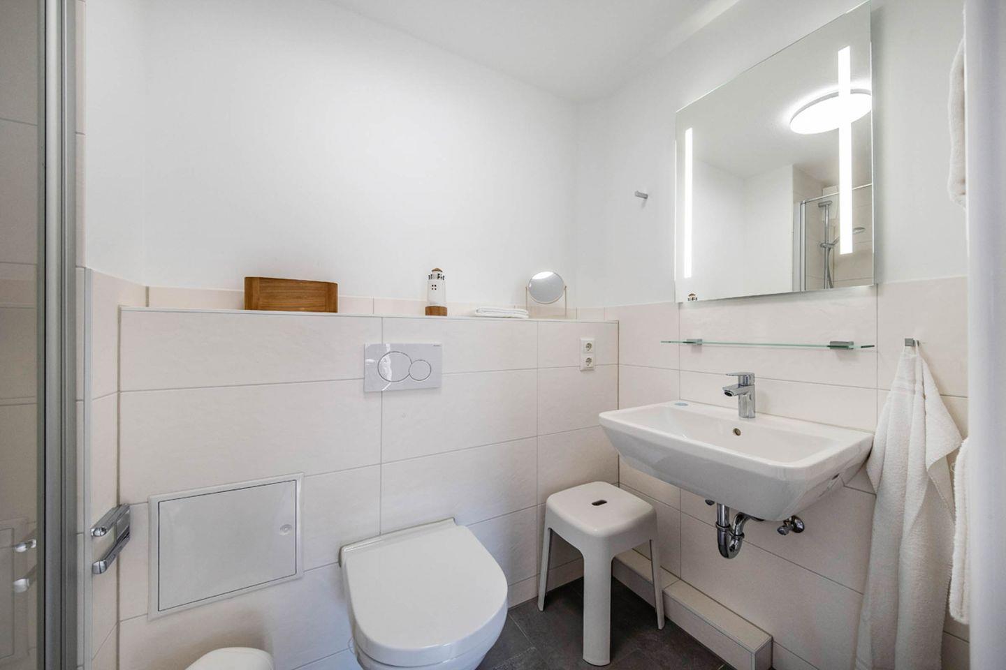 Das Badezimmer ist mit einer bodengleichen Dusche, WC und Waschbecken ausgestattet. Warmes Wasser, Spiegel und Haartrockner stehen Ihnen zur Verfügung.