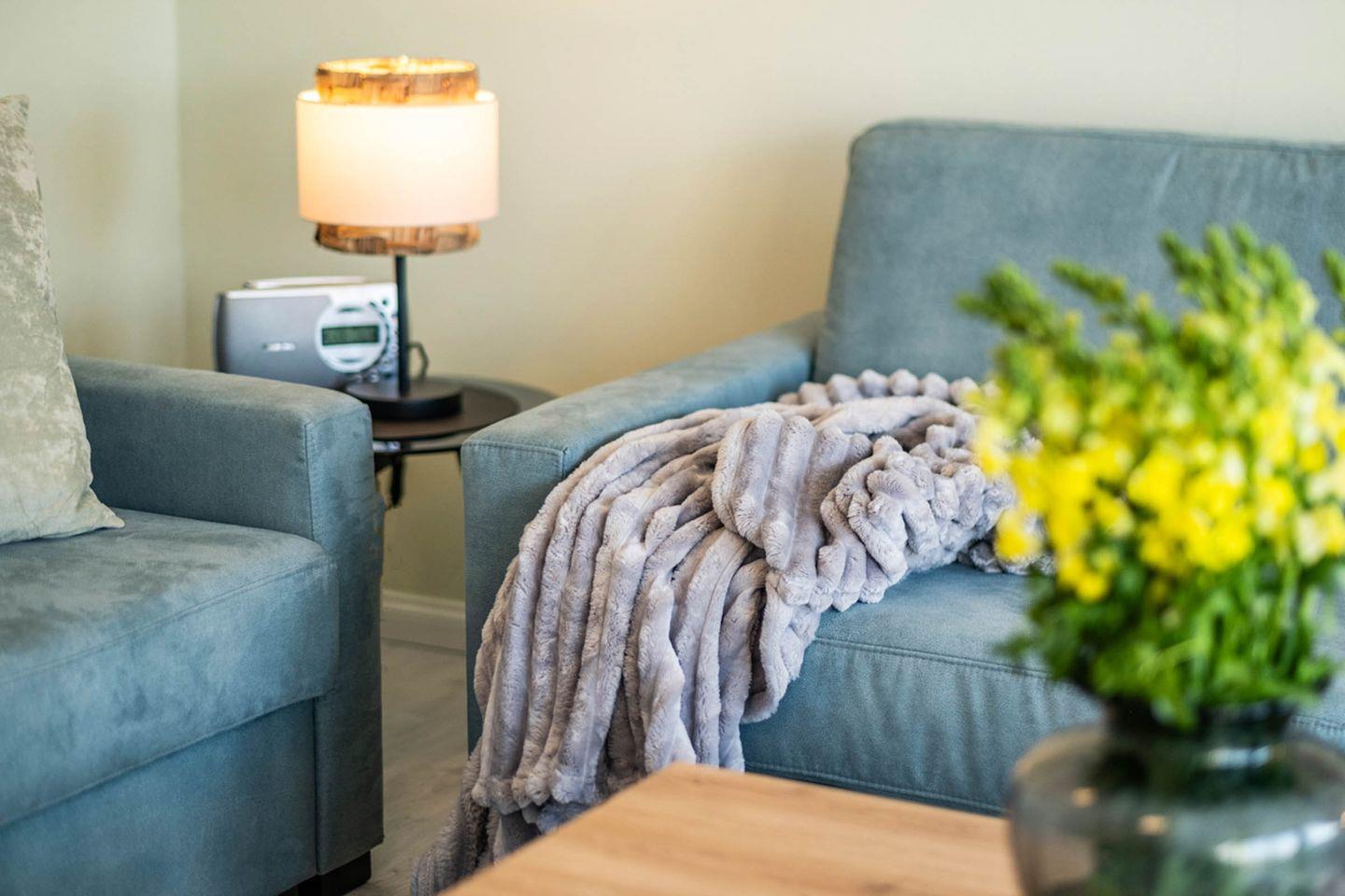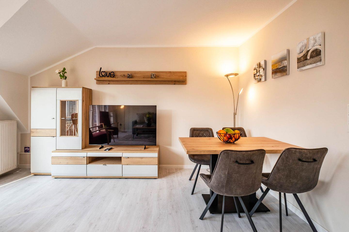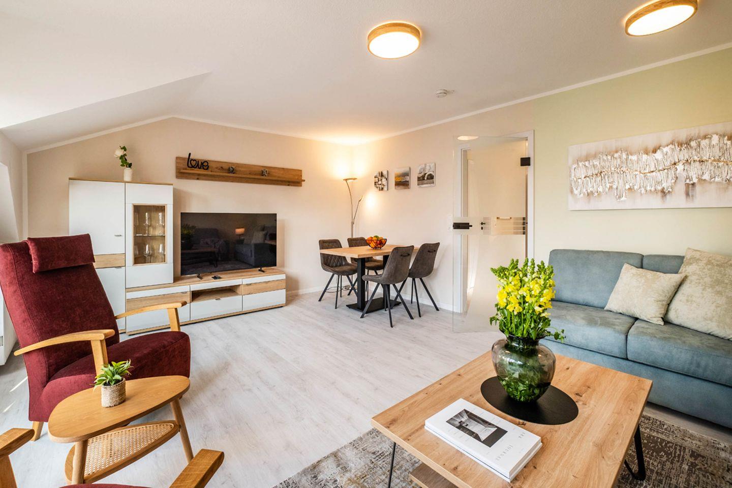 Im Wohnbereich erwarten Sie eine Sofaecke mit Sofa und Sessel sowie ein TV – passend für entspannte Abende nach einem Tag am Wasser. Eine Garderobe sowie Stauraum durch Kommode unterstützen dabei, das Gepäck ordentlich zu verstauen. Sichtschutz an allen Fenstern sorgt für Privatsphäre.