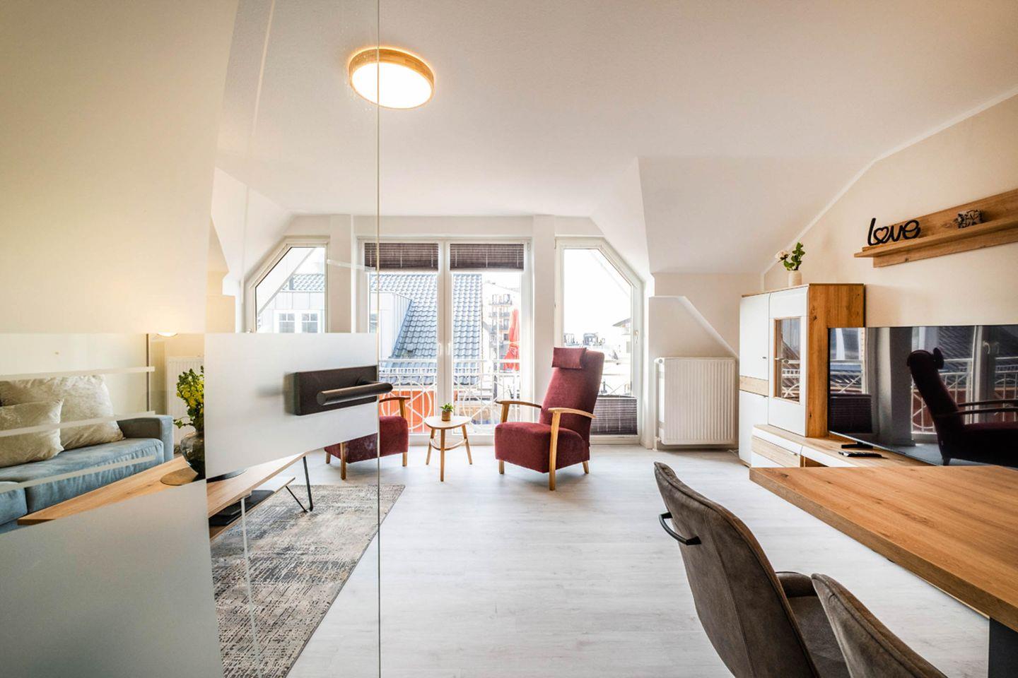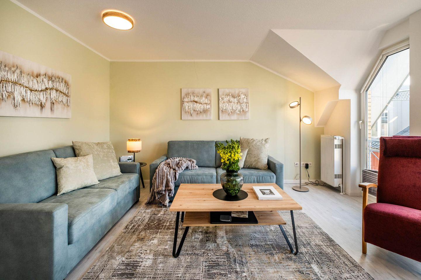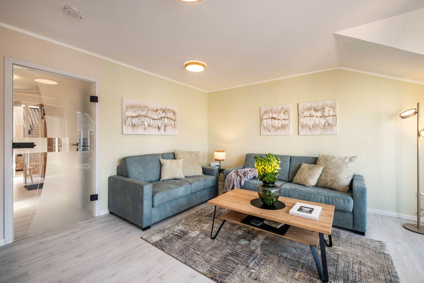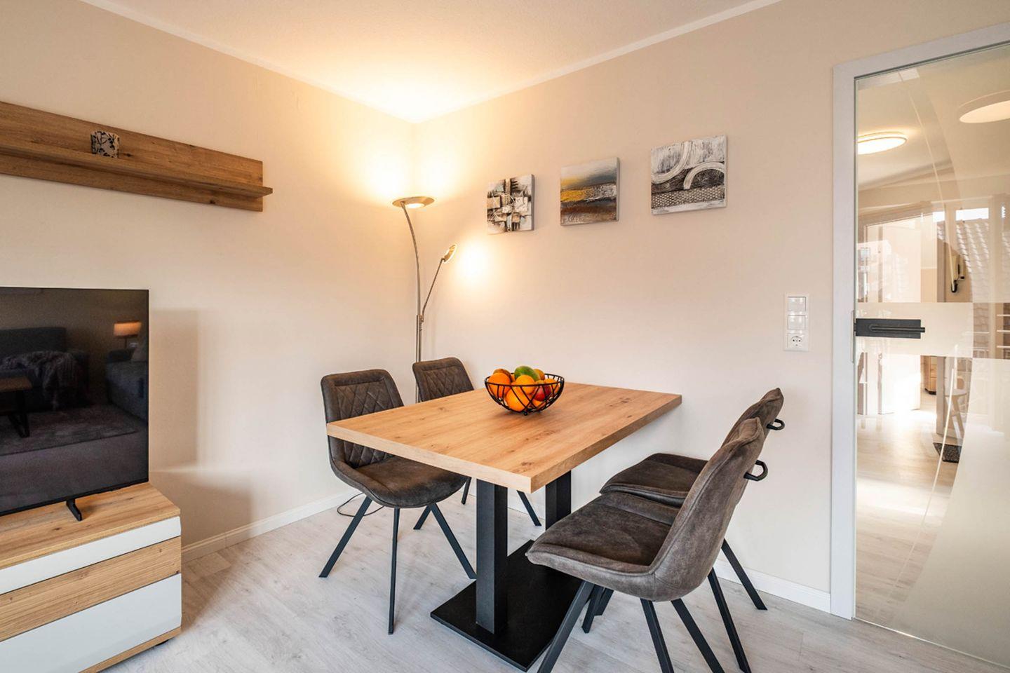 Im Wohnbereich erwarten Sie eine Sofaecke mit Sofa und Sessel sowie ein TV – passend für entspannte Abende nach einem Tag am Wasser. Eine Garderobe sowie Stauraum durch Kommode unterstützen dabei, das Gepäck ordentlich zu verstauen. Sichtschutz an allen Fenstern sorgt für Privatsphäre.
