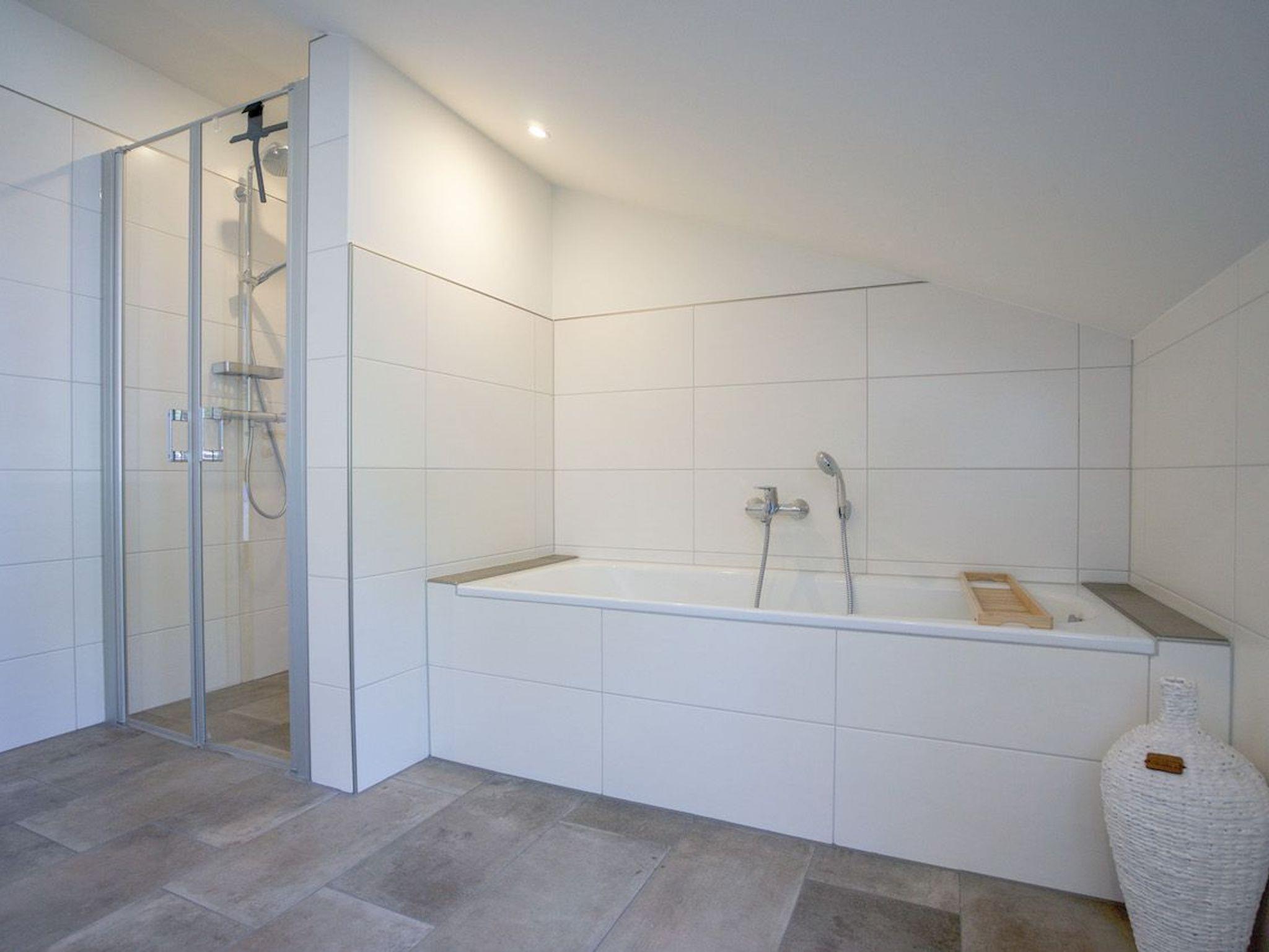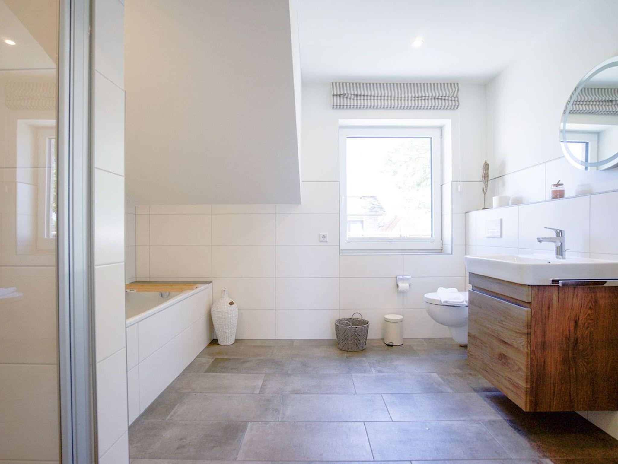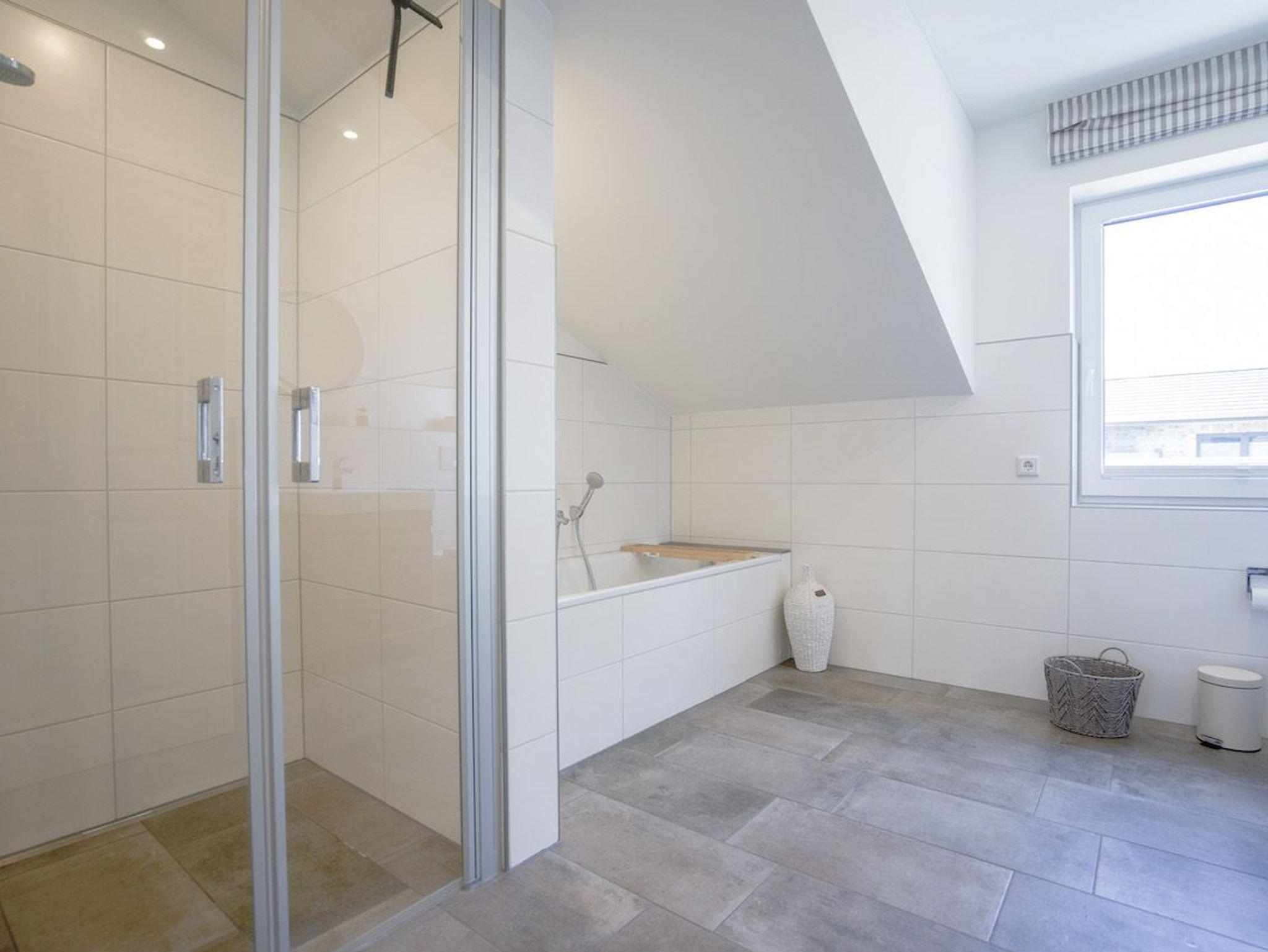 Ein schickes Duschbad mit ebenerdiger Dusche, Badewanne und Tageslicht.