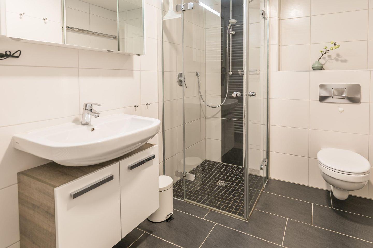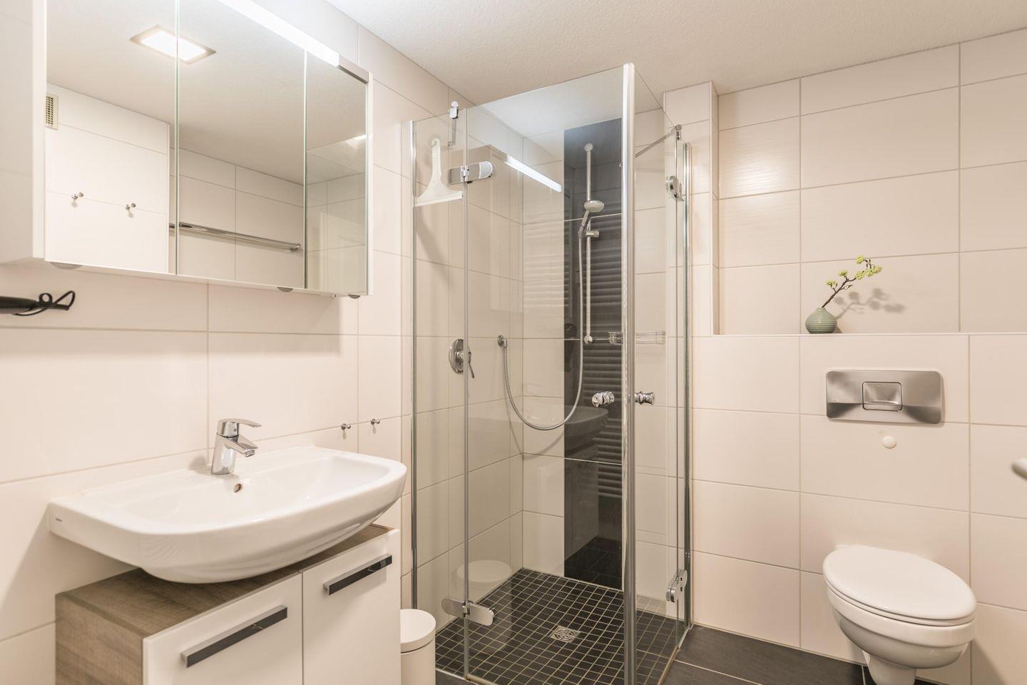 WC, Spiegel, Waschbecken, ebenerdige Dusche, Handtuchwärmer