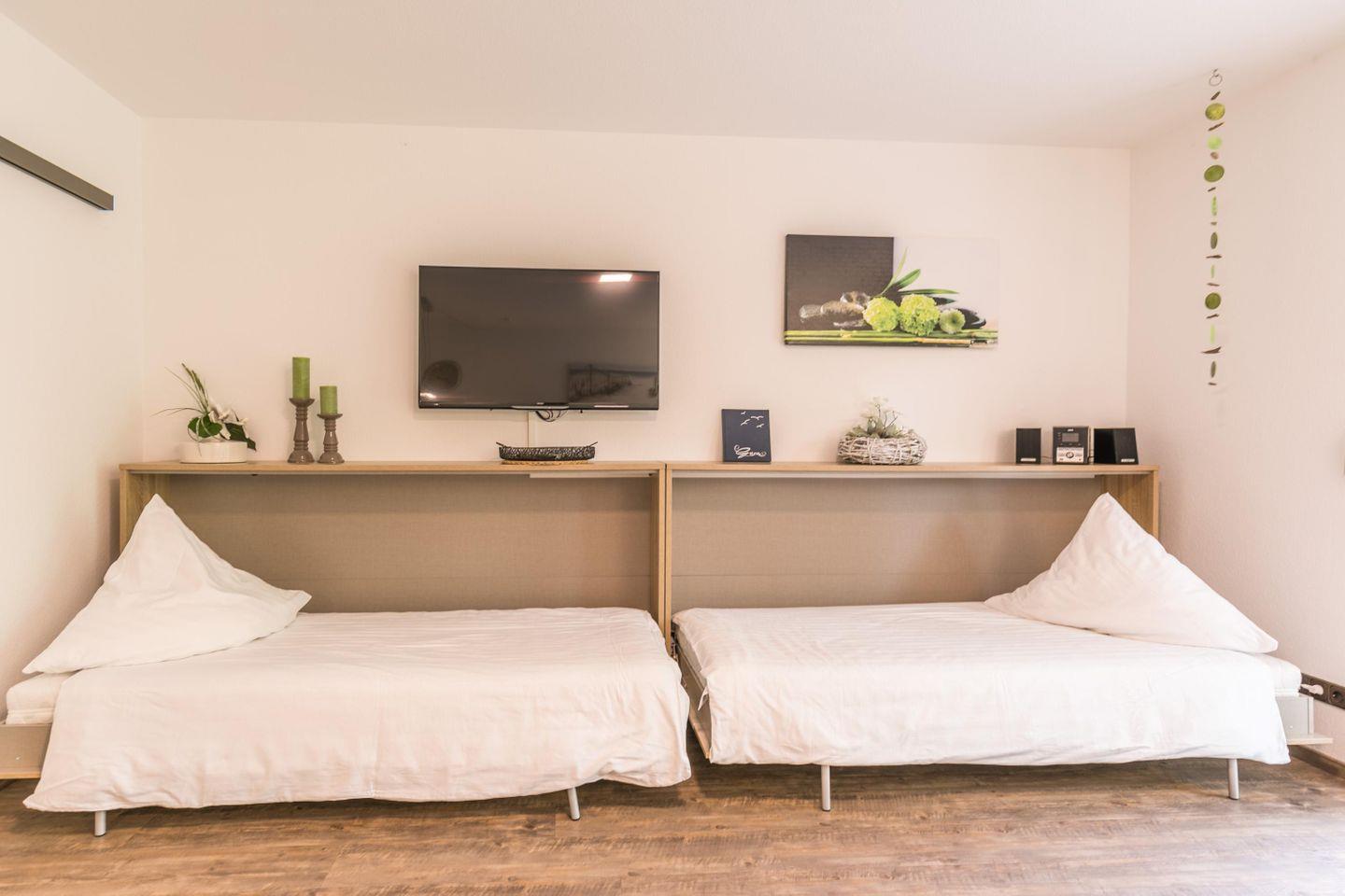 2 Einzelwandbetten, TV, Sofa, Esstisch mit 4 Stühlen, Zugang zur Terrasse