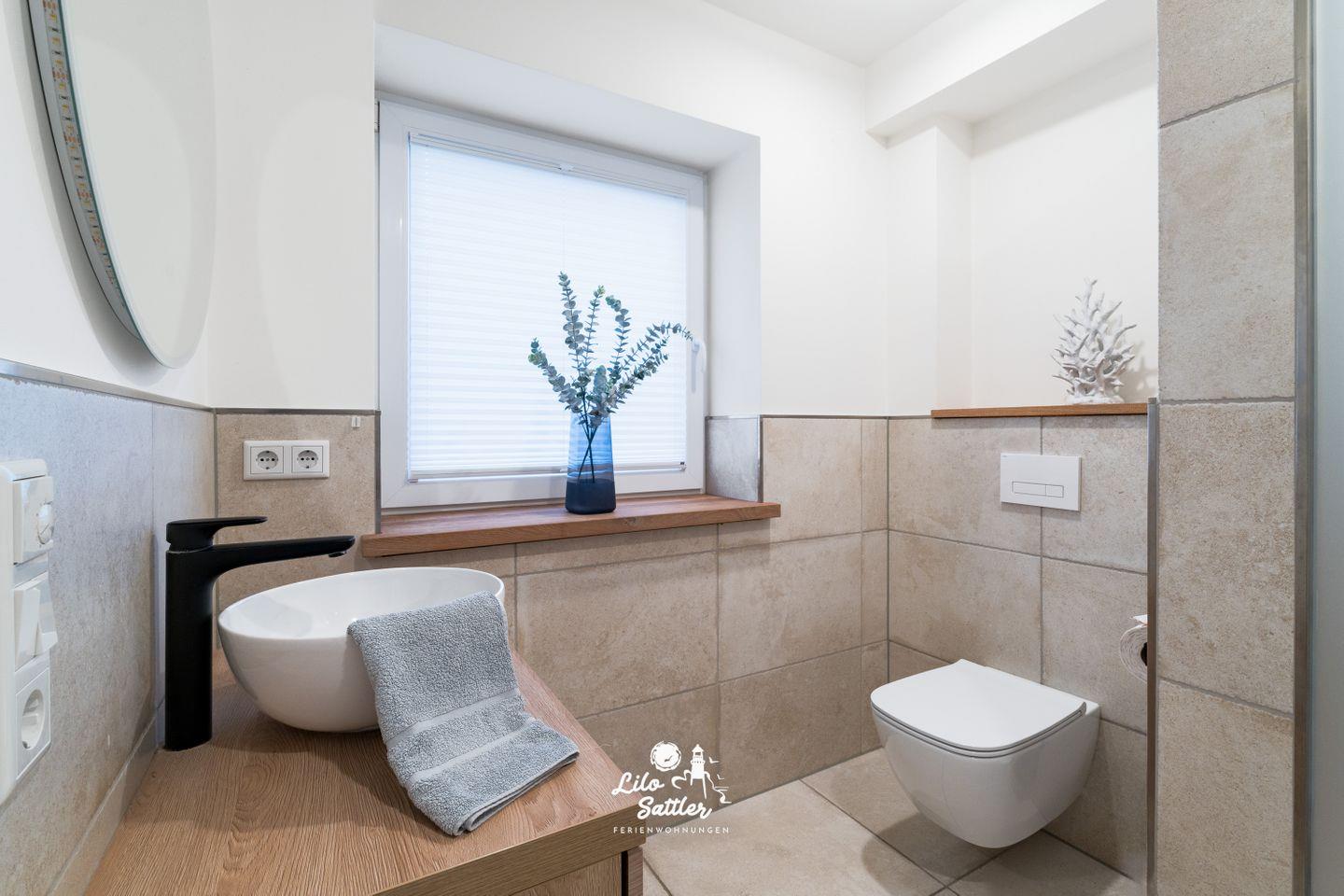 Ebenerdige Dusche, WC, Fenster, beleuchteter Spiegel, Waschtisch, Unterschrank, Fön, Handtuchtrockner,
