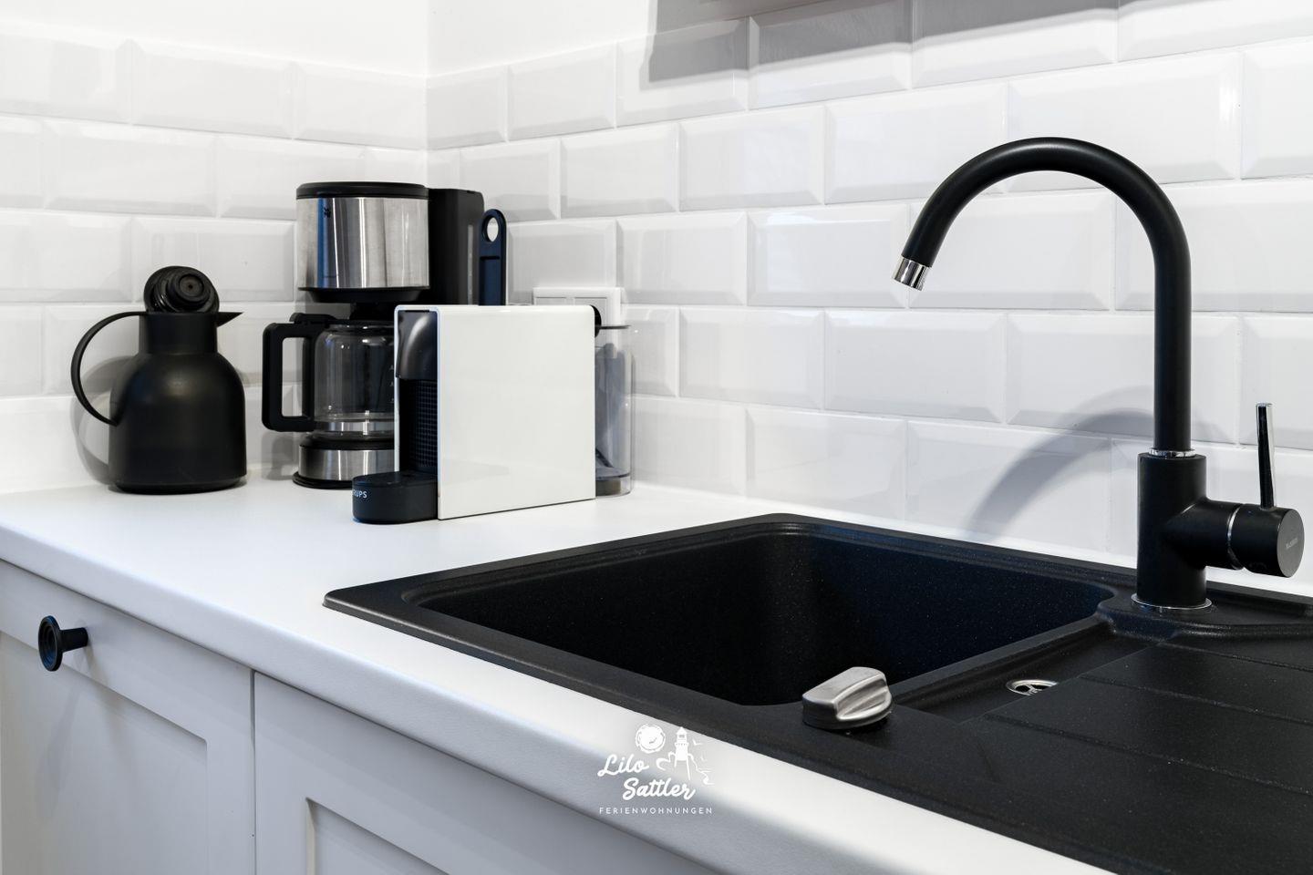 Kühlschrank, Gefrierfach, Spüle, Induktionskochfeld, Abzug, Backofen, Geschirrspüler, Mikrowelle, Wasserkocher, Toaster, Kaffeemaschine, Espressomaschine