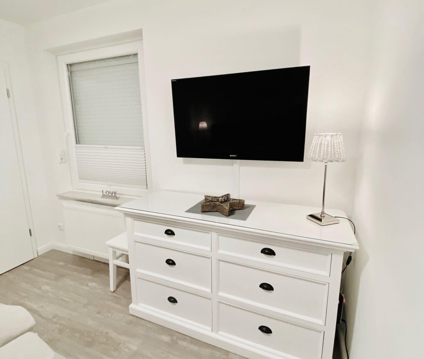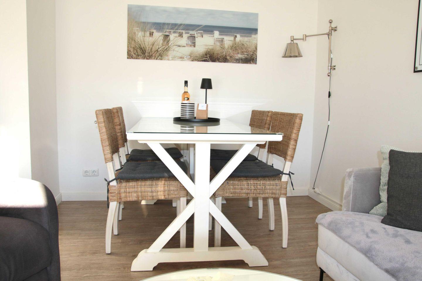 Beim Betreten der Deichstern Ferienwohnung werden Sie von einem gemütlichen Wohnbereich empfangen, der mit einer komfortablen Sofaecke, einem Esstisch und modernem Laminatboden ausgestattet ist. Genießen Sie gemeinsame Stunden beim Fernsehen mit Kabelanschluss, nutzen Sie darüber hinaus den Blu-ray und DVD-Player für gemütliche Filmabende oder surfen Sie mit dem kostenlosen WLAN durch das Netz. Die offene Küche ist mit allen notwendigen Annehmlichkeiten ausgestattet: Herd, Backofen, Mikrowelle, Geschirrspüler und Kühlschrank mit Gefrierfach bieten alles, was Sie für die Zubereitung leckerer Mahlzeiten benötigen. Hier können Sie auch den Kaffee aus der Maschine oder mit dem Wasserkocher einen Tee genießen und sich auf der überdachten Terrasse entspannen, der einen herrlichen Blick in den Garten eröffnet.