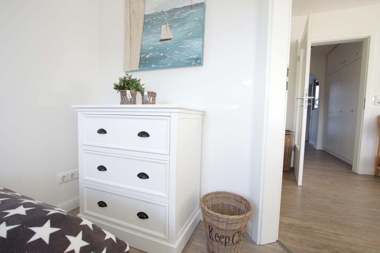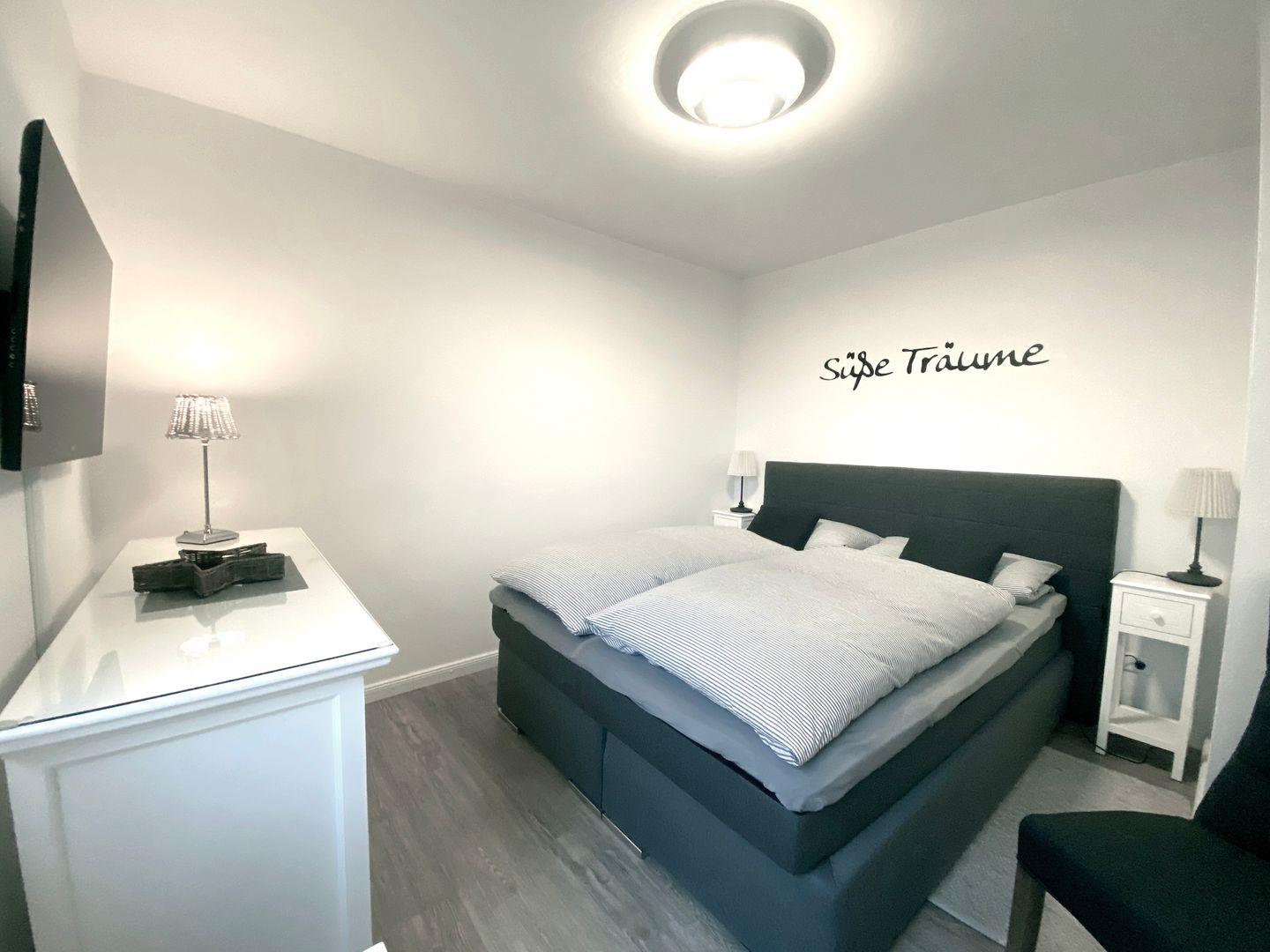Das Schlafzimmer ist zum Träumen perfekt eingerichtet. Laminatboden sorgt für ein warmes und einladendes Ambiente, das zum Entspannen einlädt. Neben einem zweiten Schlafzimmer gibt es ein modernes Badezimmer mit einer bodengleichen Dusche, einem Haartrockner und einem großen Spiegel.