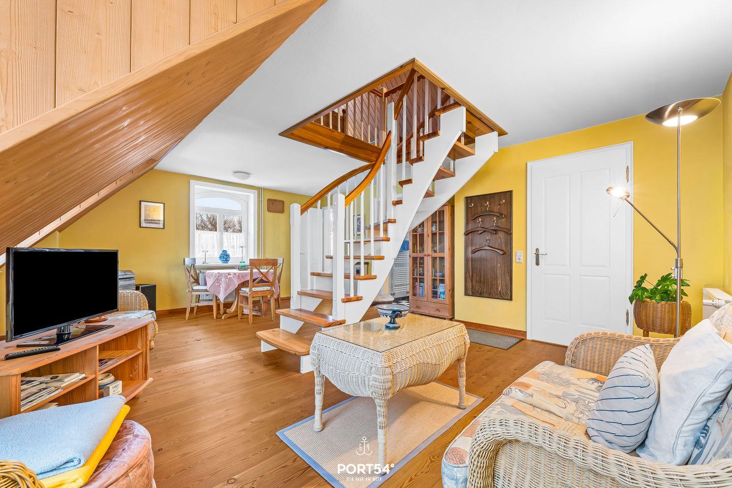 Die rund 50 m² große Wohnung liegt im ersten Obergeschoss eines gepflegten Hauses in einer ruhigen Seitenstraße und bietet eine behagliche Atmosphäre für Paare und kleine Familien. Der offen gestaltete Wohn- und Essbereich ist lichtdurchflutet und lädt mit gemütlichem Mobiliar zum Verweilen ein – ob beim gemeinsamen Frühstück oder einem entspannten Abend nach einem Strandspaziergang. Die integrierte Küche ist gut ausgestattet, sodass Du Dich auch im Urlaub bequem selbst versorgen kannst.