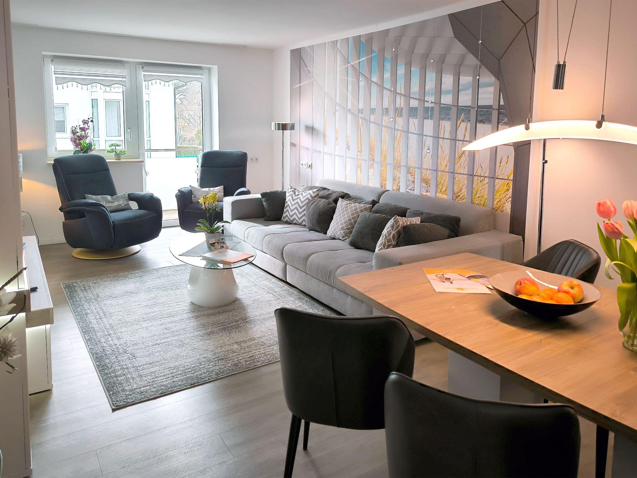 Individuell-moderne Ferienwohnung für 4 Personen: In dieser liebevoll eingerichteten Wohnung mit vielen schönen Details finden Sie auf 104 qm alles, was man für einen gelungenen Urlaub benötigt. In dem Wohnzimmer lässt sich auf dem hochwertigem Sofa und den bequemen Sesseln herrlich entspannen und zur Ruhe kommen.