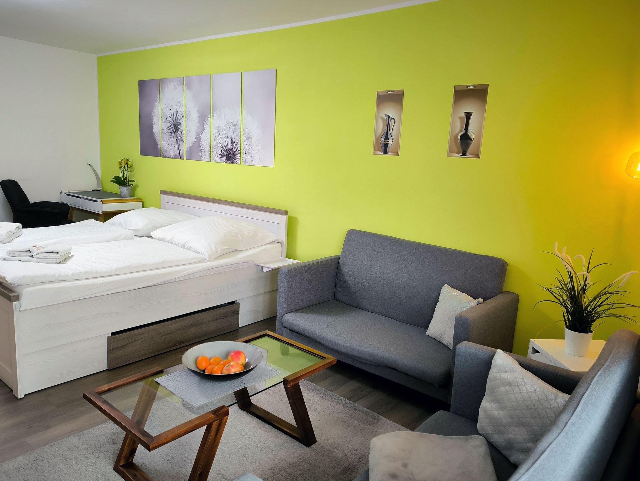 Ein Bügeleisen mit Brett, ein Babybett sowie ein Kinderhochstuhl sind zugegen. Aufzug, WLAN sind ebenfalls vorhanden. Ein PKW-Außenstellplatz/Tiefgaragenstellplatz (ggf. kostenpflichtig) gehört zu Ihrer Wohnung oder kann gemietet werden.