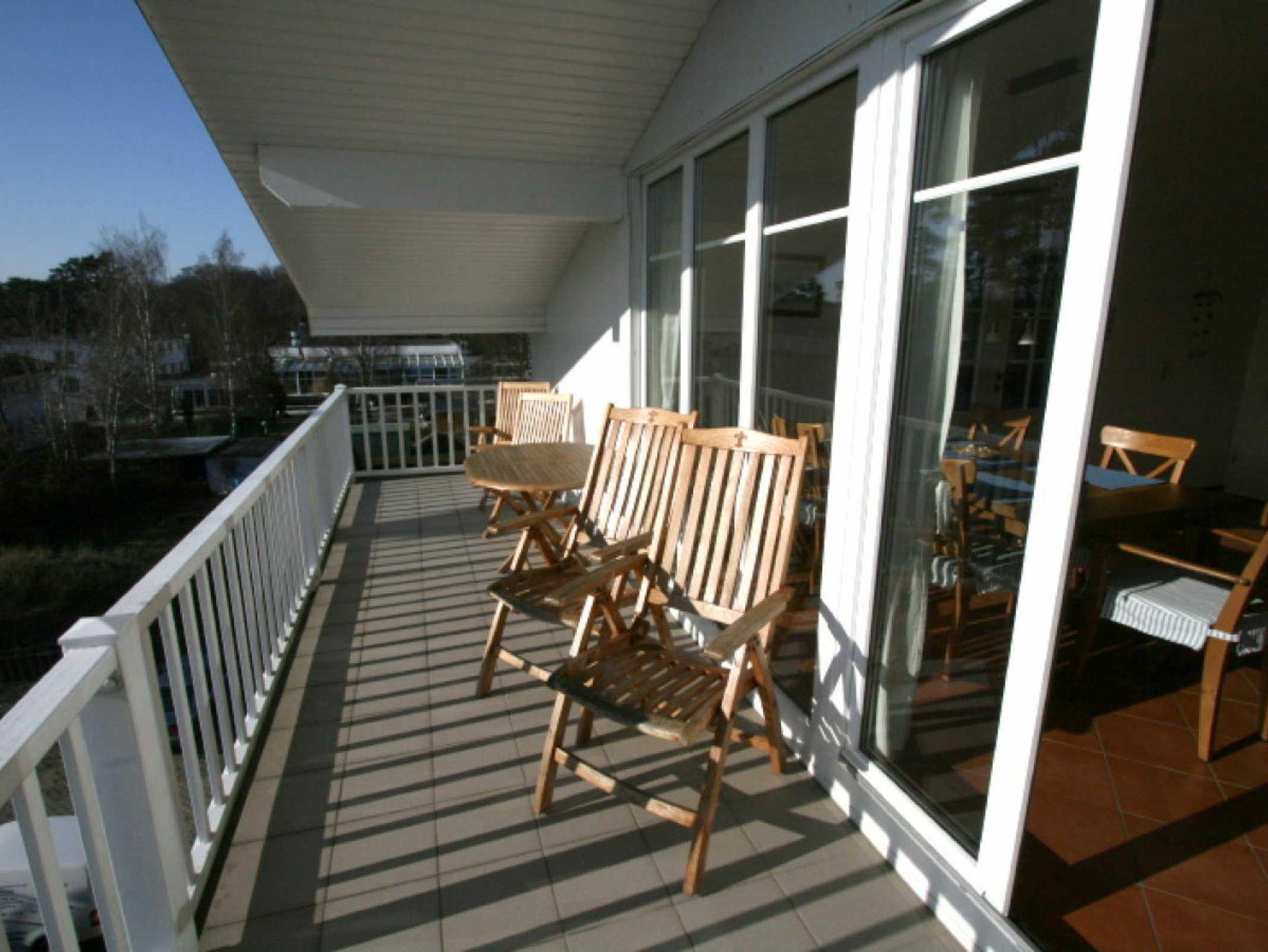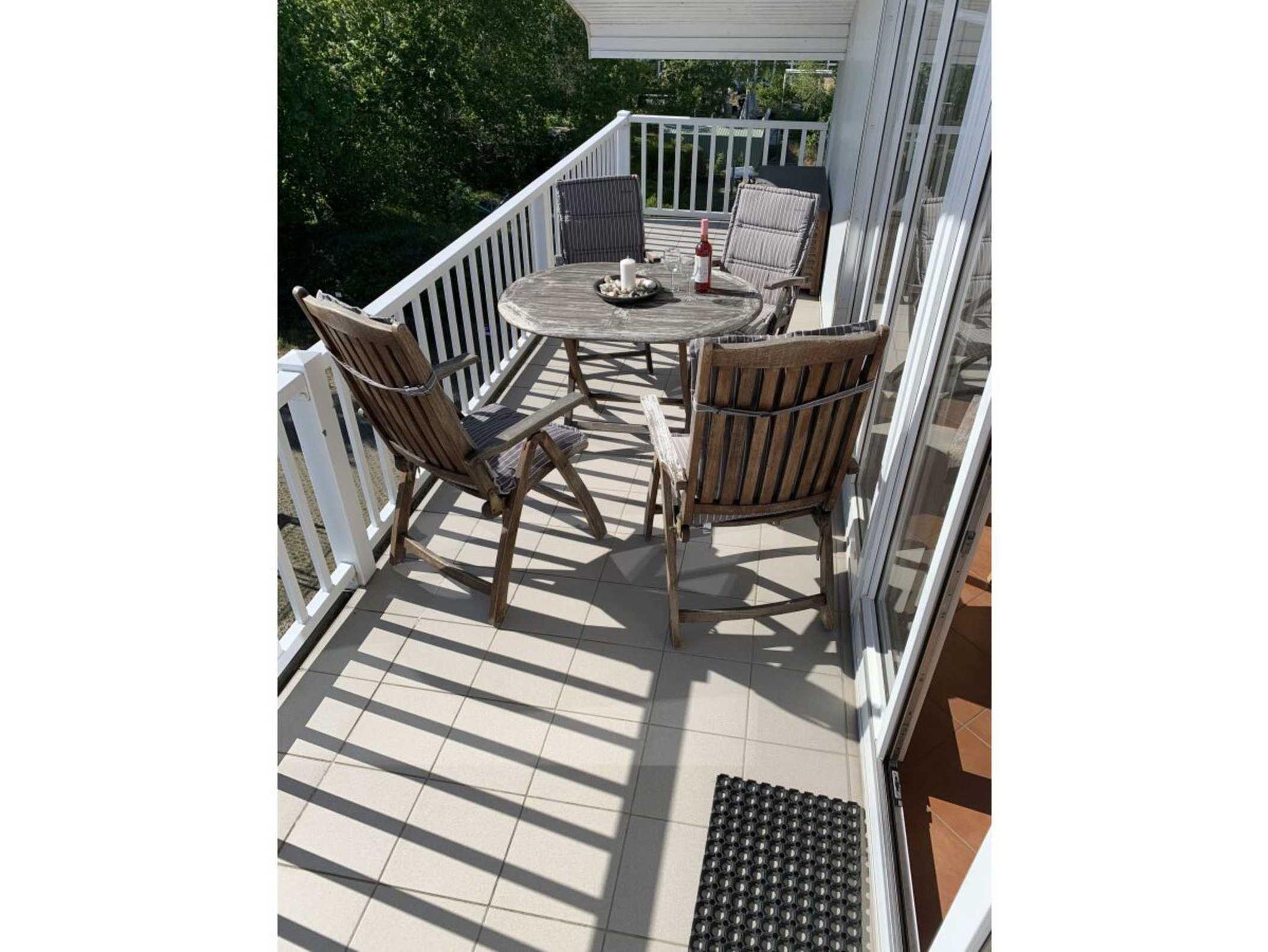 Zu dieser Ferienwohnung gehört ein schöner 14 qm großer Balkon mit Gartenmöbeln und Blick auf die Strandstraße.