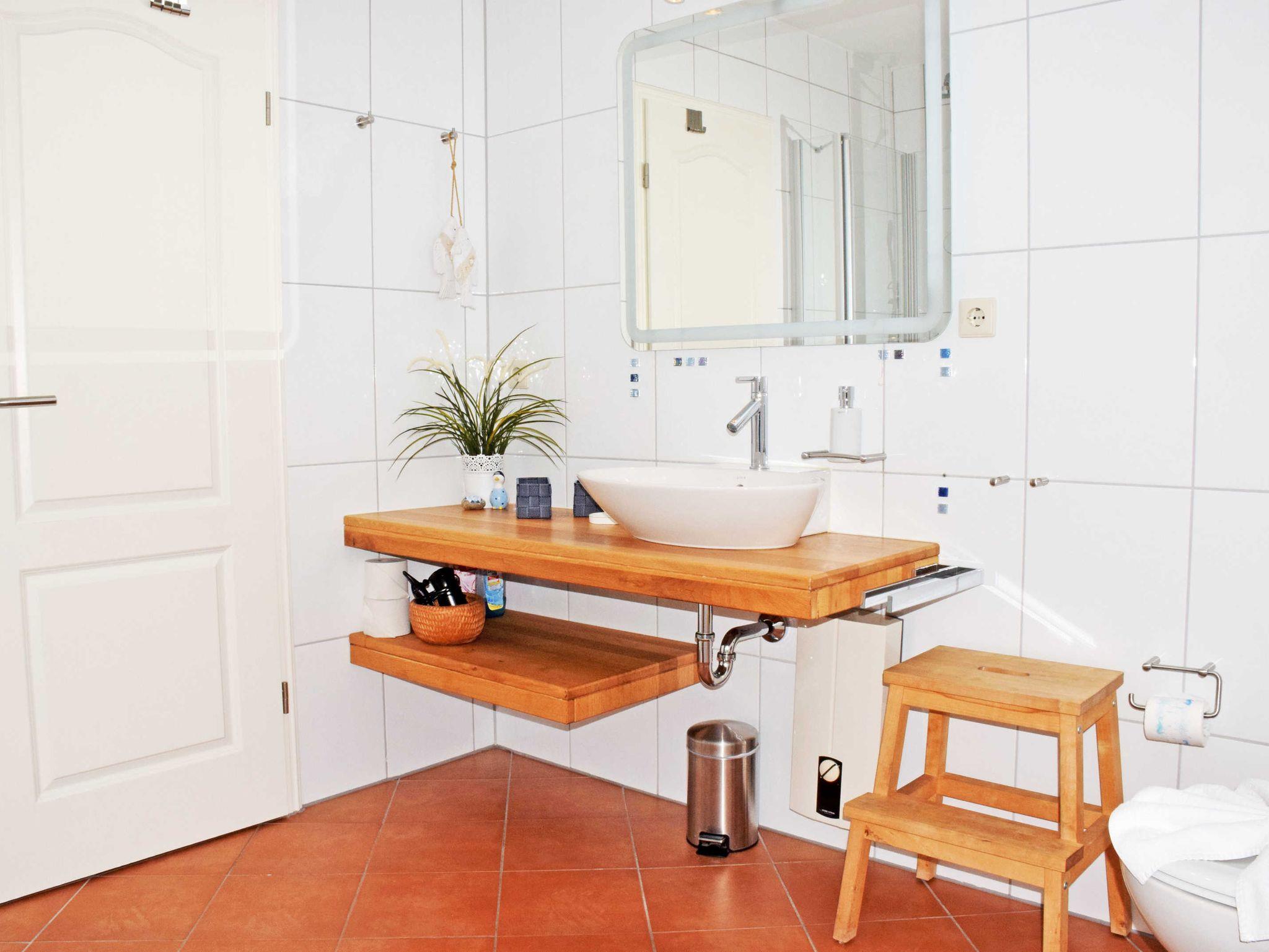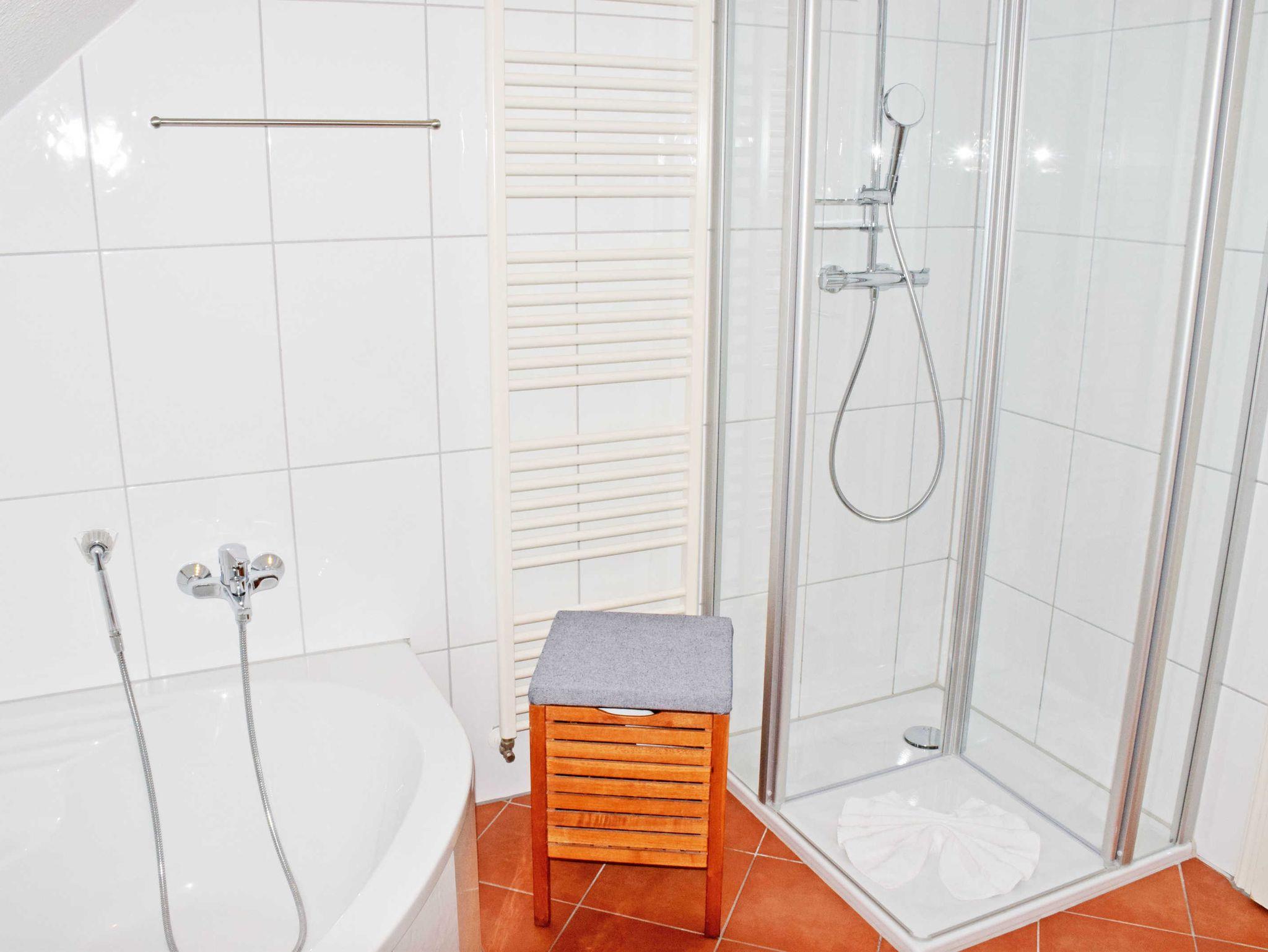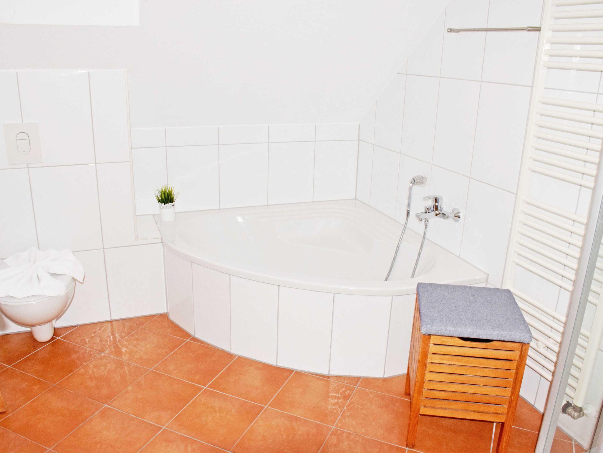 Das moderne Bad ist mit Dusche, WC und Waschtisch sowie Fön ausgestattet. Zum Entspannen können Sie sich ein Bad in der geräumigen Eckbadewanne gönnen oder bequem duschen.